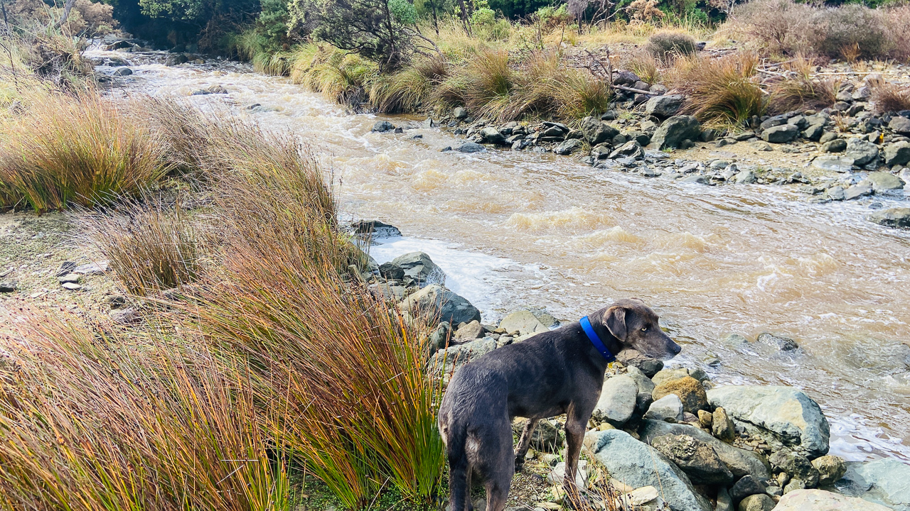 86. Je n'ai pas pu atteindre la prise d'eau, bloque par un torrent trop fort pour etre sur. Je reviens donc a la riviere, qui croise maintenant la maree montante.