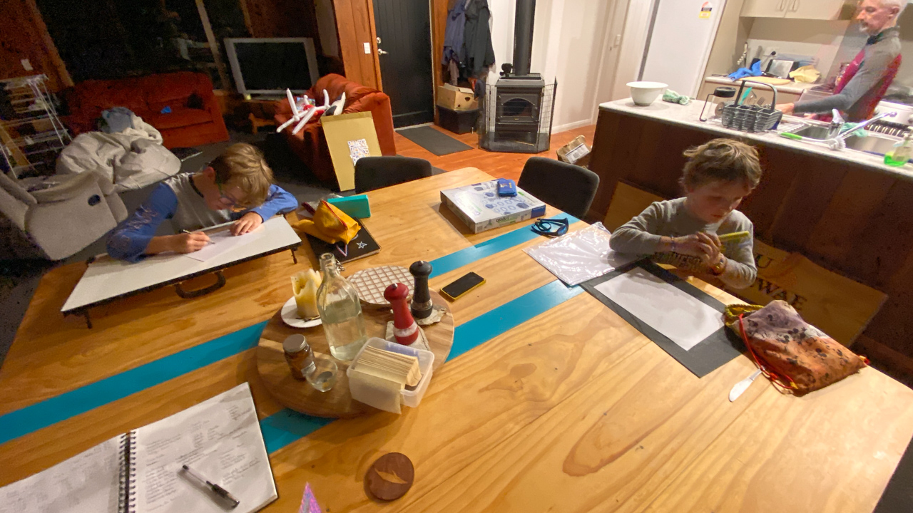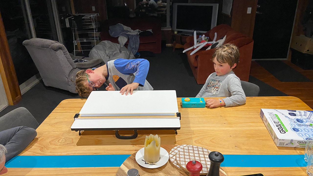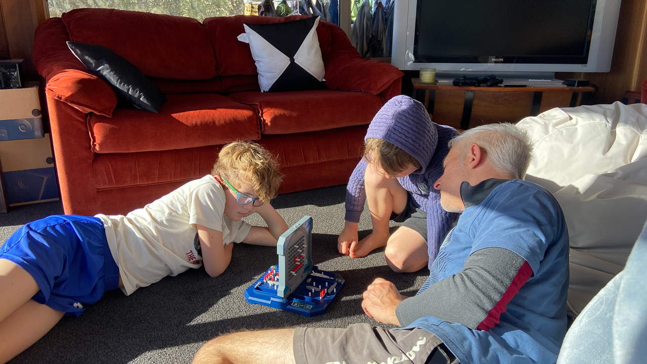 187. Samedi midi: Oban et Leo, les enfants d'un autre "voisin" dont nous avons fait la connaissance en Janvier, viennent passer l'apres-midi avec les enfants. Tout le monde y trouve son compte, et s'y on en croit les rires, ils passent tous un bon moment!