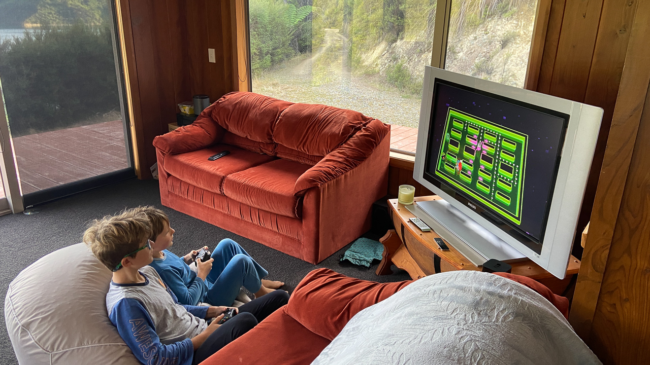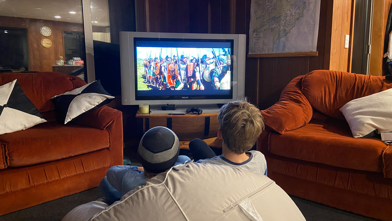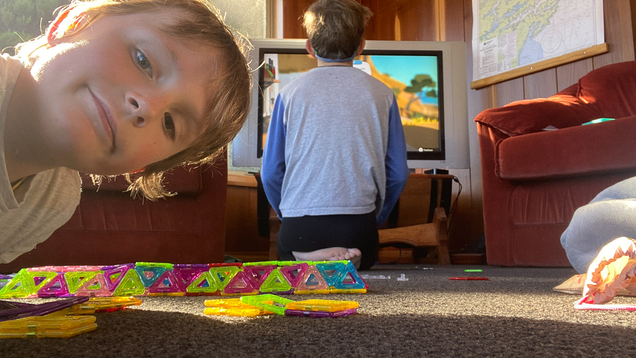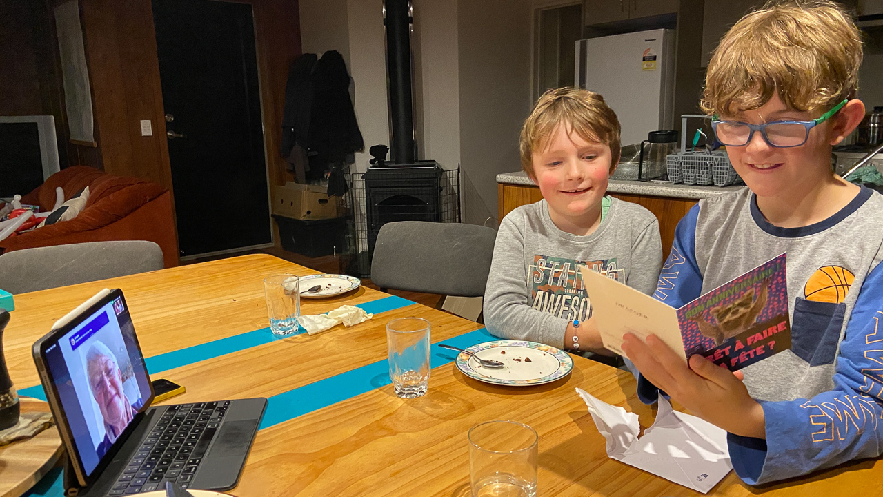 187. Samedi midi: Oban et Leo, les enfants d'un autre "voisin" dont nous avons fait la connaissance en Janvier, viennent passer l'apres-midi avec les enfants. Tout le monde y trouve son compte, et s'y on en croit les rires, ils passent tous un bon moment!