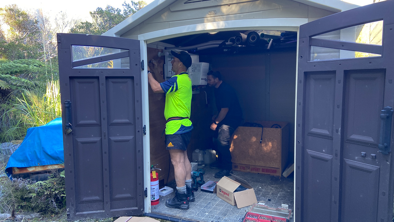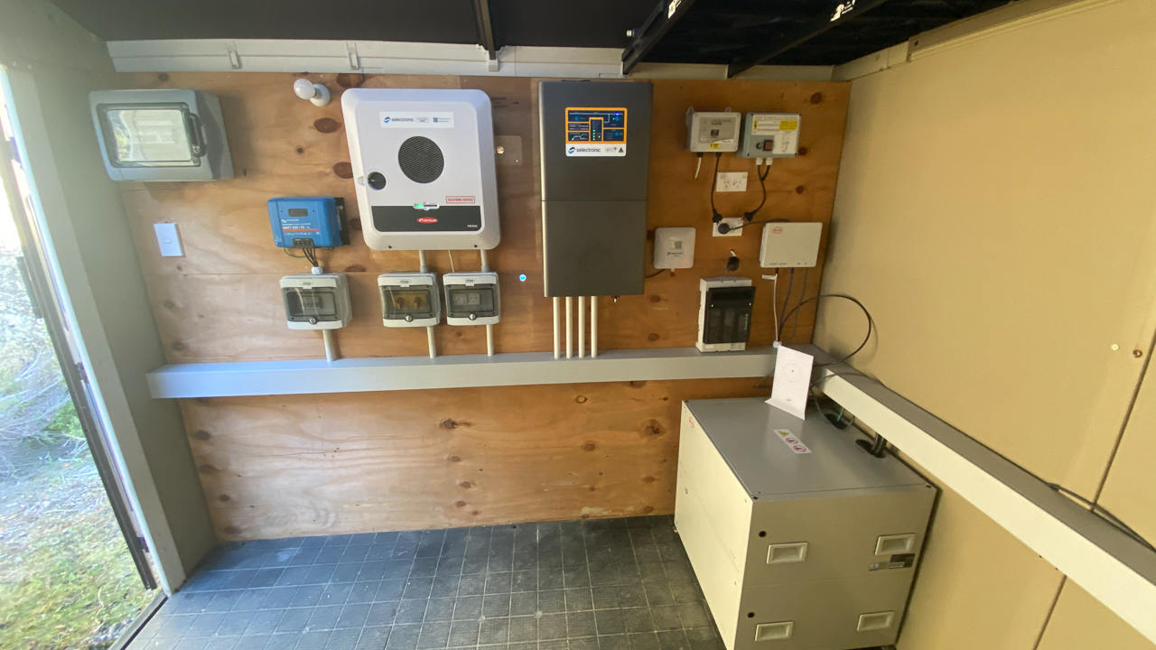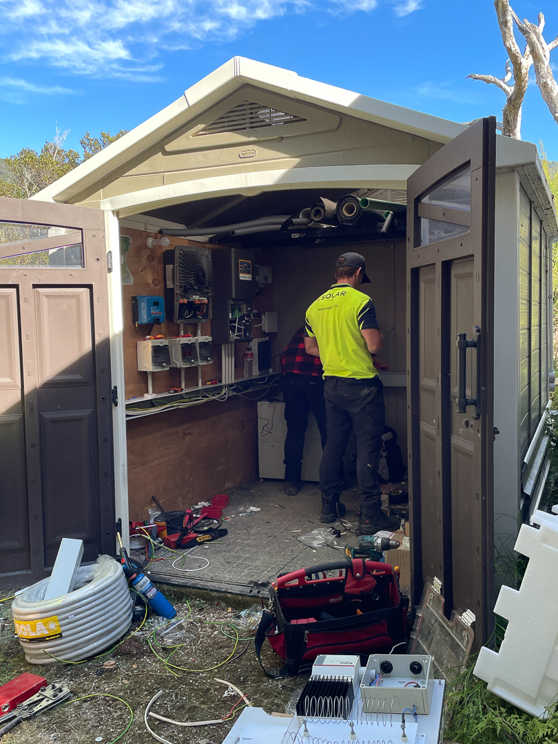 173. Dans le shed, l'installation est terminee. Le bloc bleu a gauche est le nouveau controlleur de l'hydro. On ne devrait plus trop en avoir besoin, mais ce sera un bon complement les jours ou il ne fait pas assez beau.