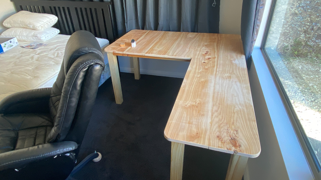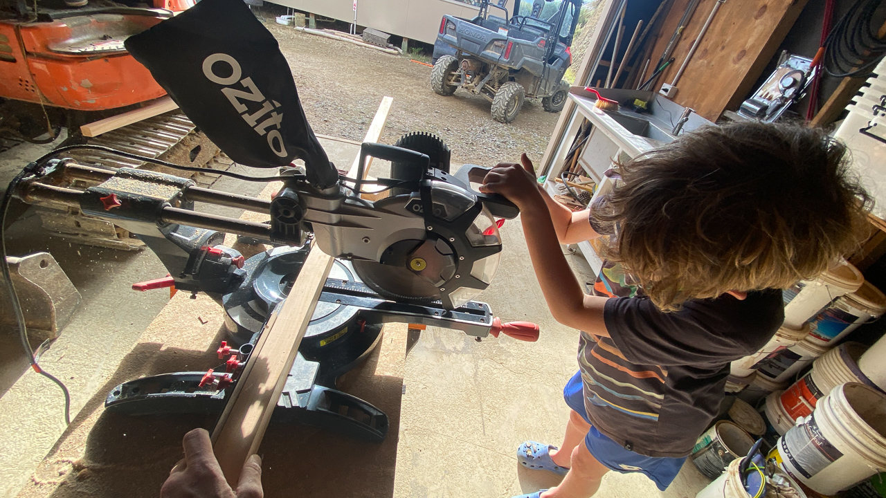 214. Avec les restes inutilises du bois pour la chambre, je fabrique un bureau ... les enfants me filent un coup de main.