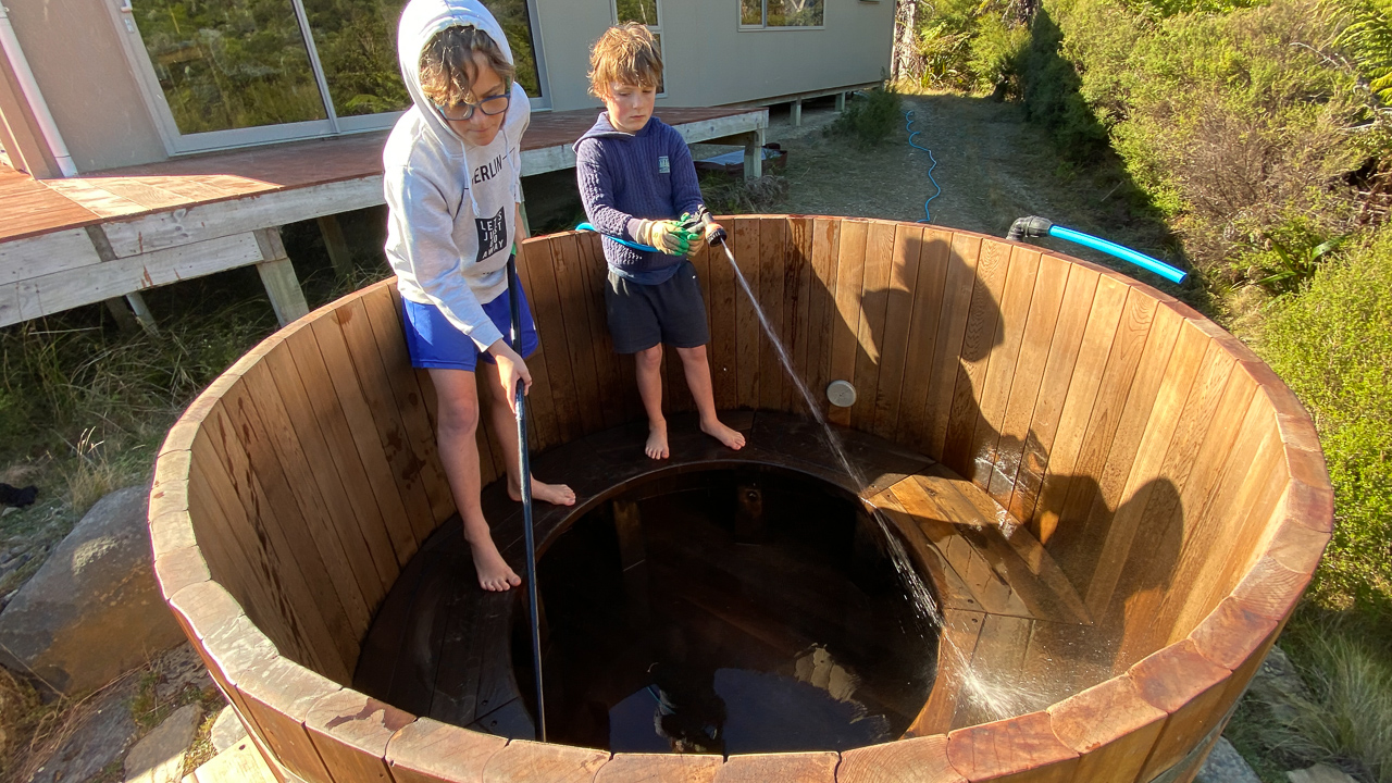 239. Ce mois en apeusanteur commence a toucher a sa fin. On replie le spa, et les enfants nous filent un coup de main pour le nettoyer.