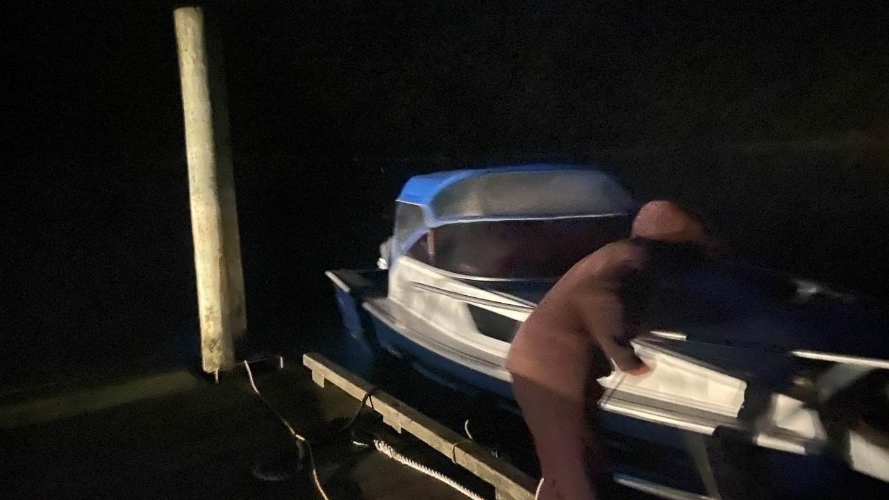91. Toutes ces precipitations ont rempli le bateau. Je descends a temps pour activer la pompe de cale.