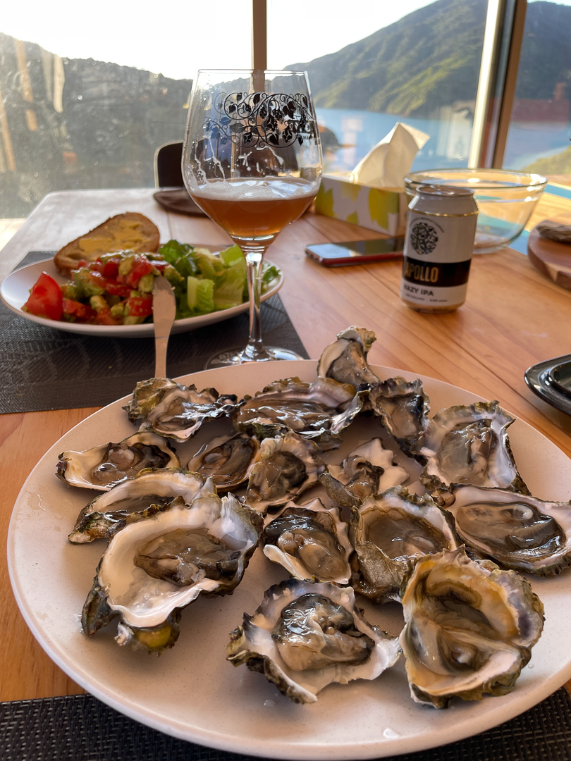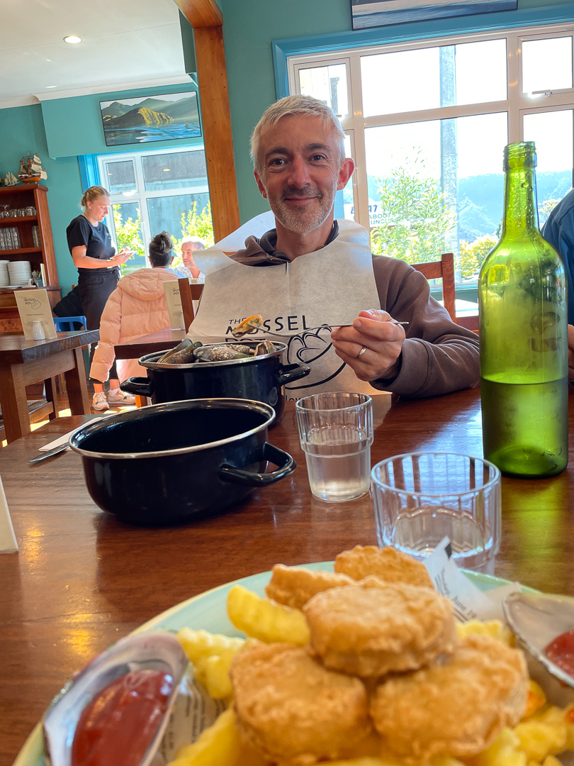 251. A Havelock, alors que tout a ete remis en place, le bateau et nos affaires, on descend notre premier repas au resto en un mois. La consigne: pas de limite!