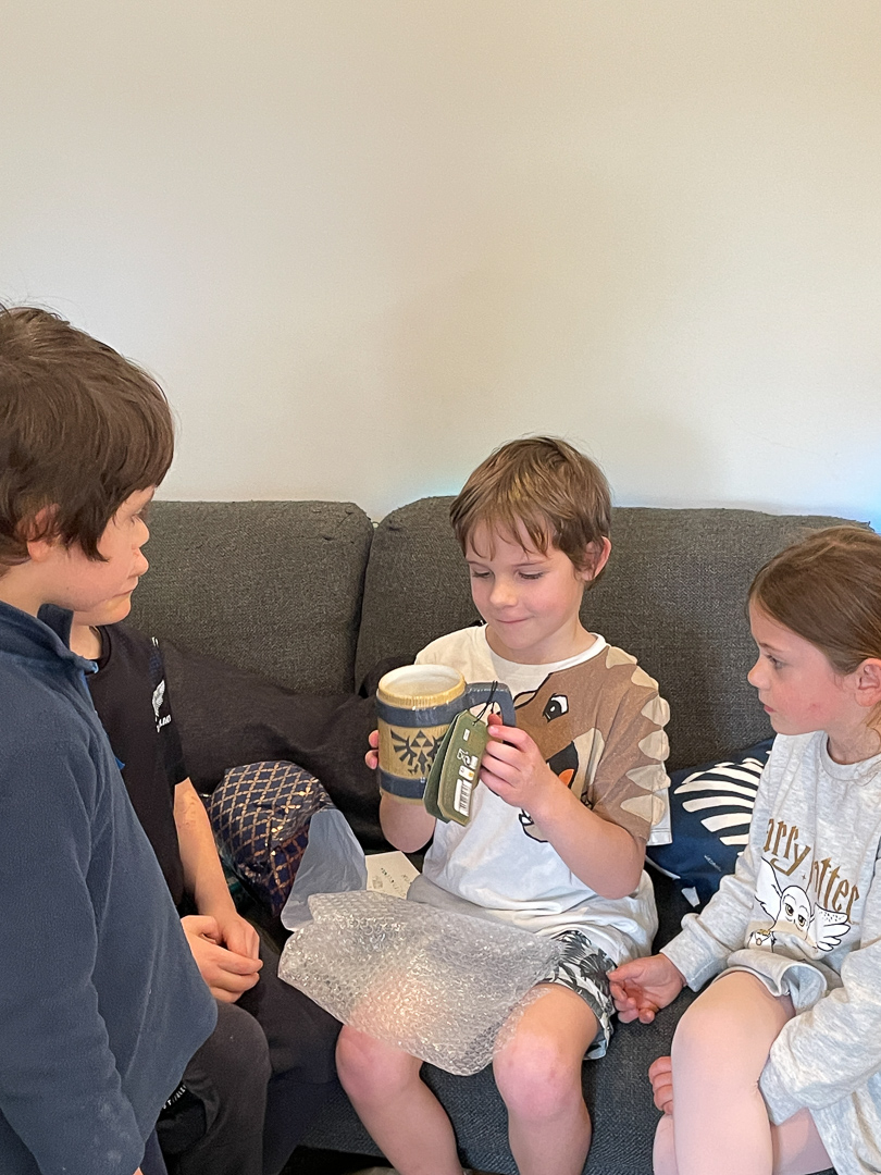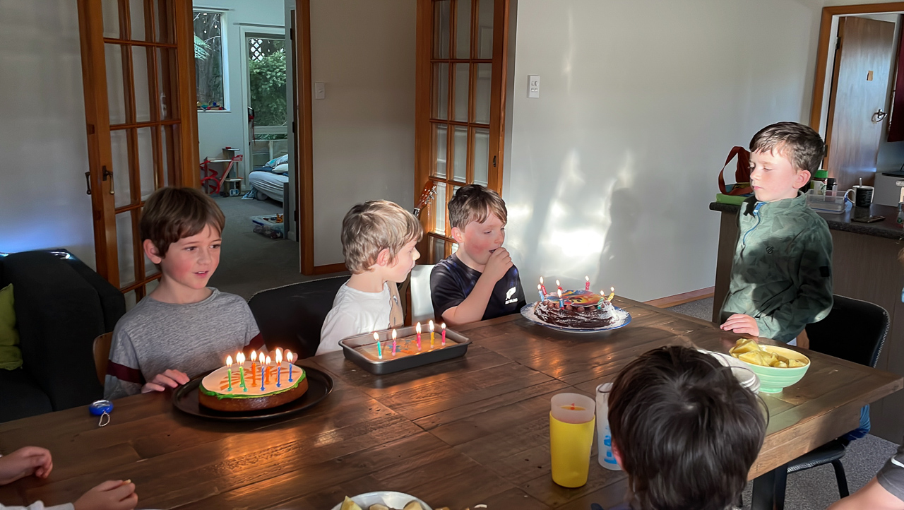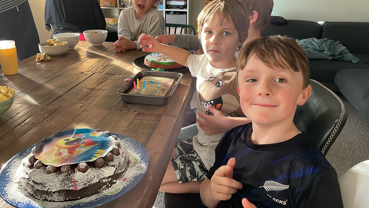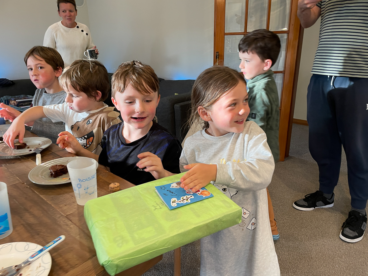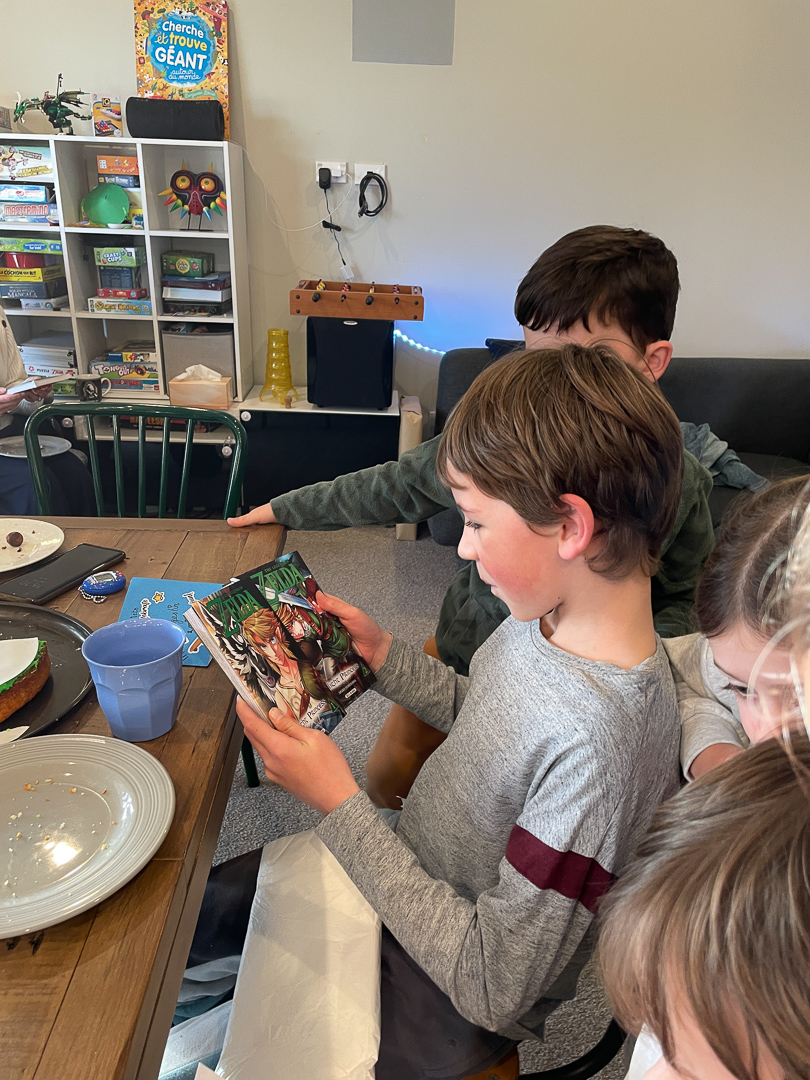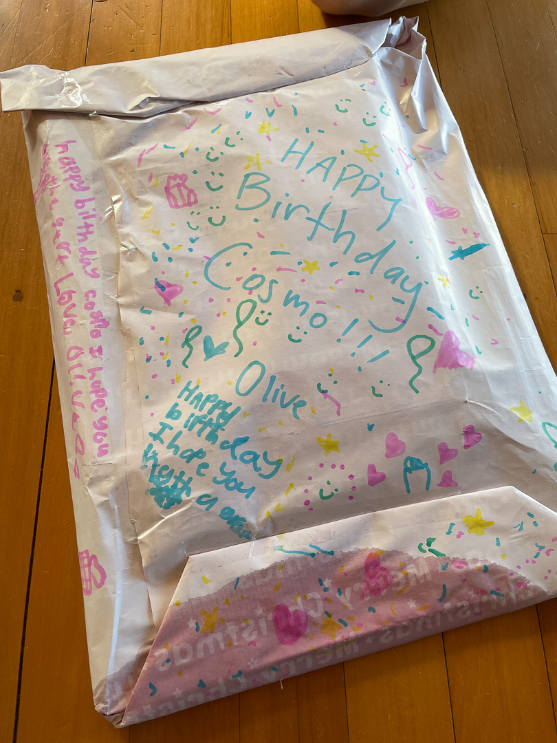 4. Pour Cosmo, c'est le debut des festivites: il est attache a avoir comme son frere qui avait eu une fete avec ses ami.e.s, ses cousin.e.s et sa famille!