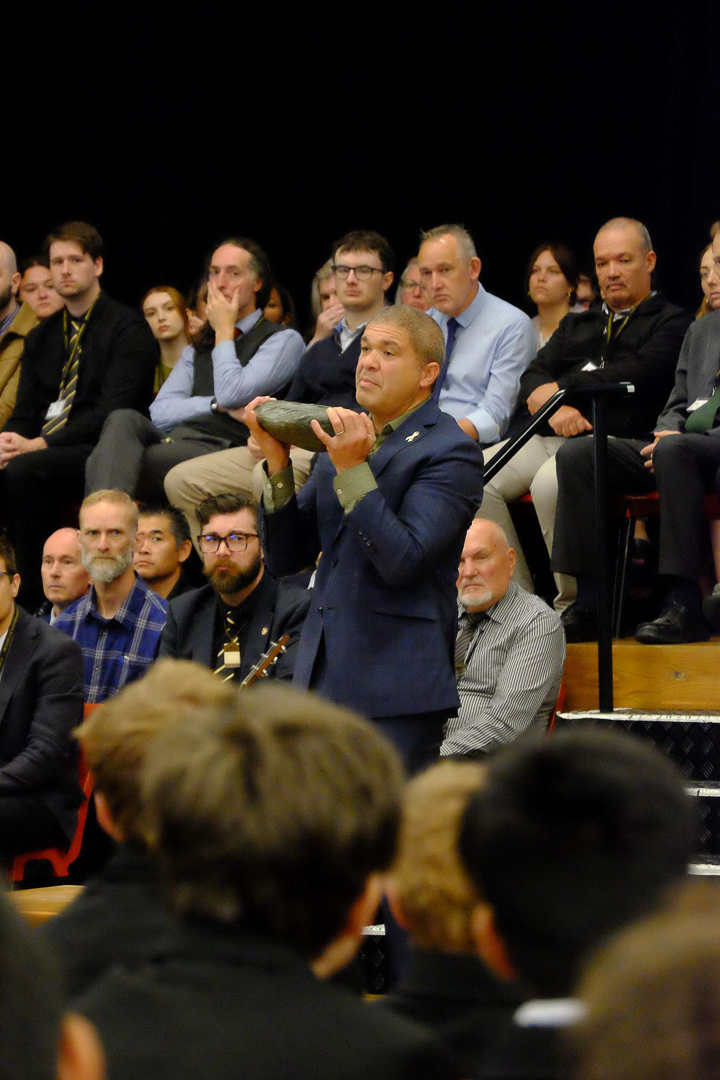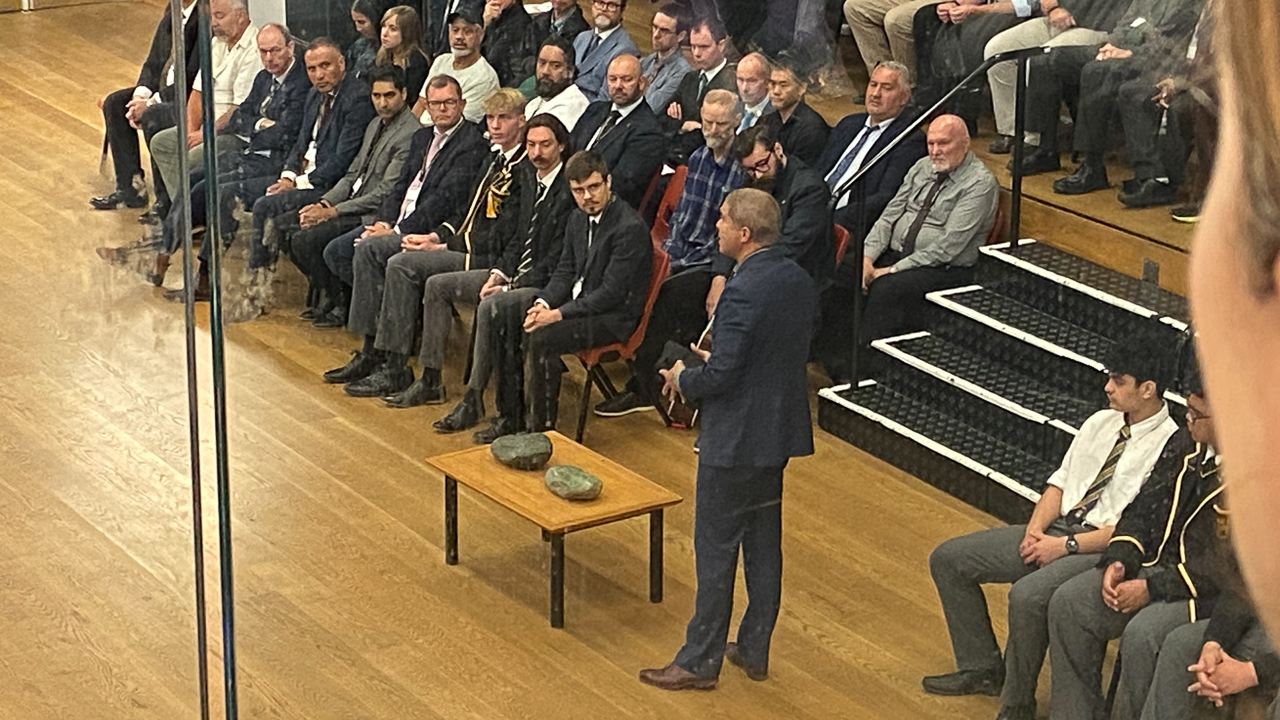 33. Deux pounamus sont ensuite reveles. Chacune a recu un nom evoquant le don (de l'ecole vers les eleves) et la gratitude (de l'eleve, qui redonne ensuite a l'ecole). C'est une premiere, ce sont des presents offerts par une iwi de l'Ile du Sud. Elles ont une grande valeur, et pas que spirituelle, et accompagneront les enfants jusqu'a ce qu'ils quittent l'ecole.