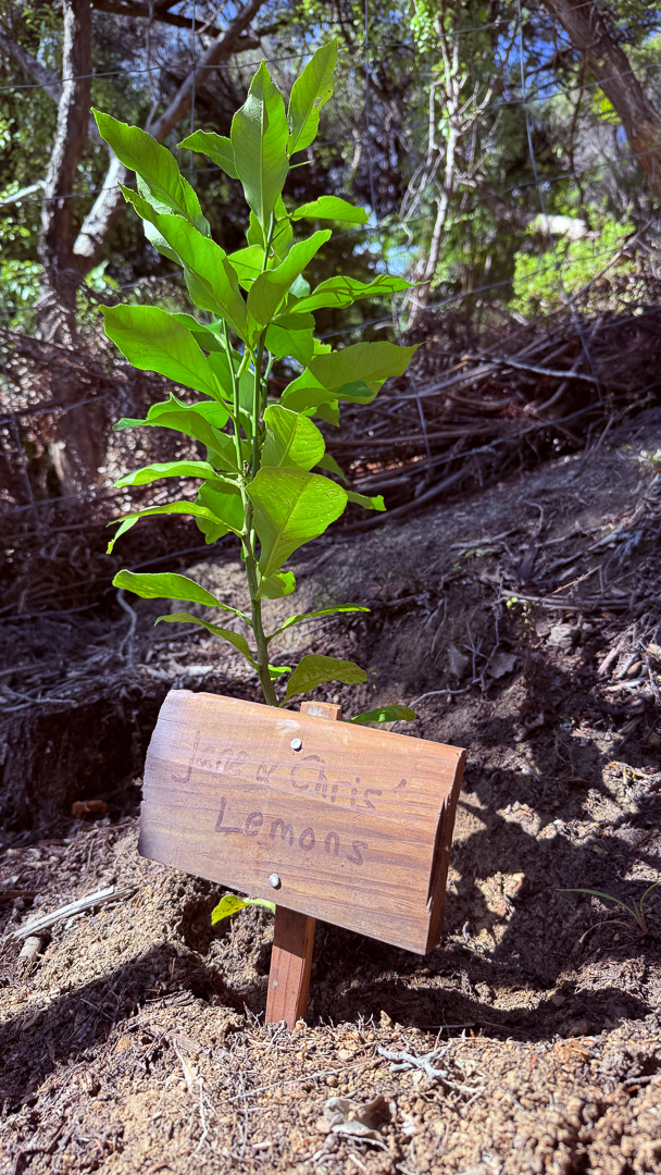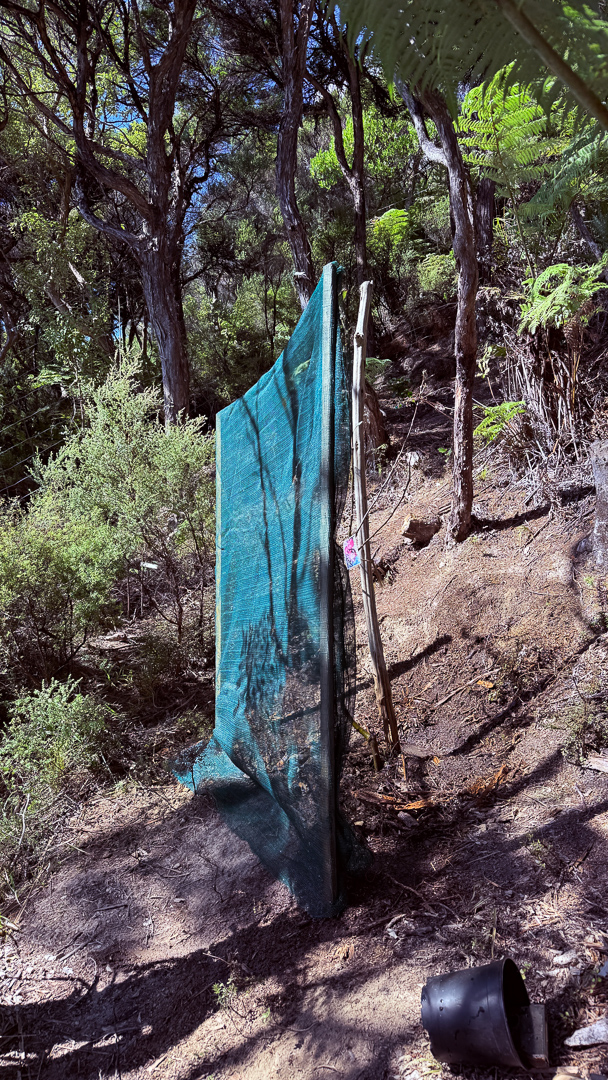 33. On installe une protection contre le vent pour aider un pommier a resister. Sinon, tous les autres abres et plantes ont bien passe le dernier mois.