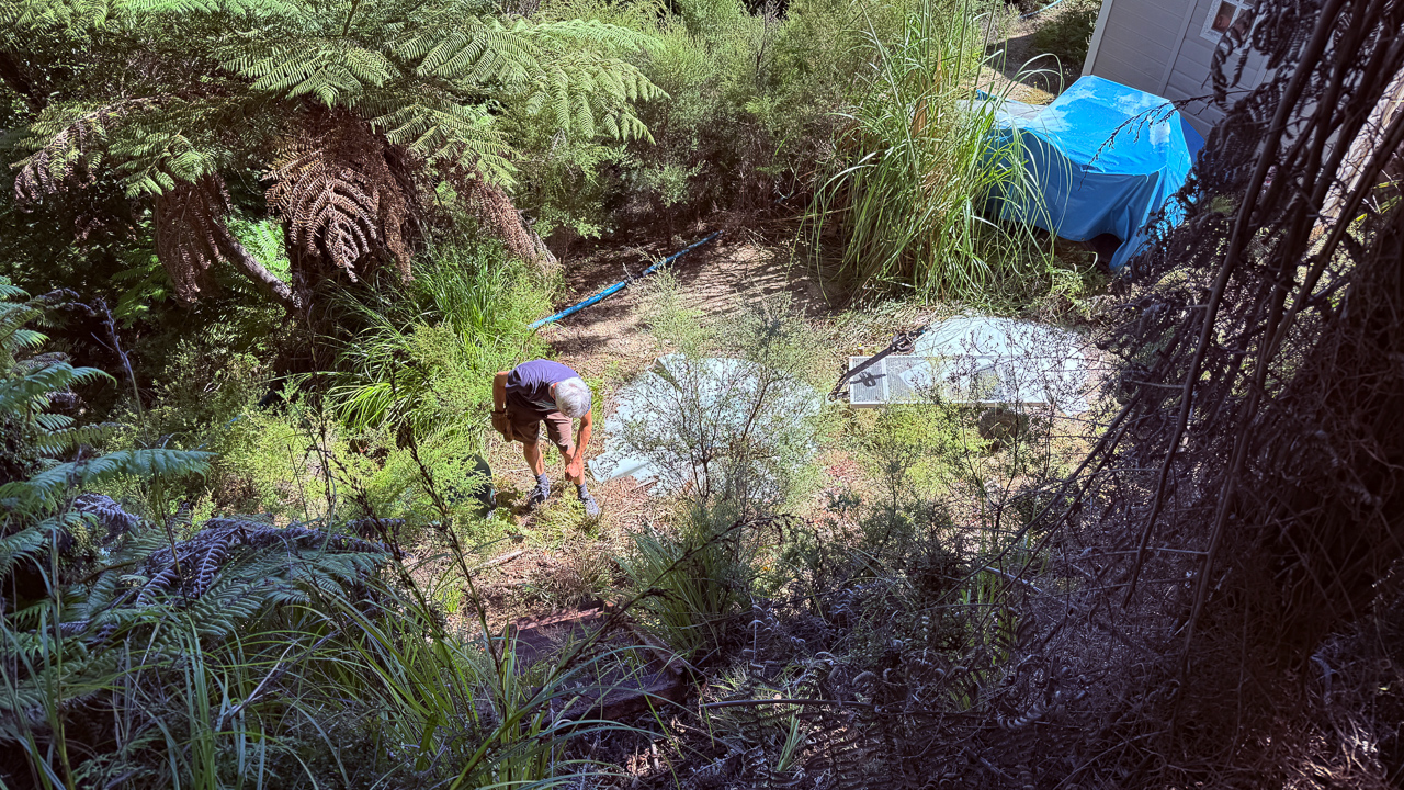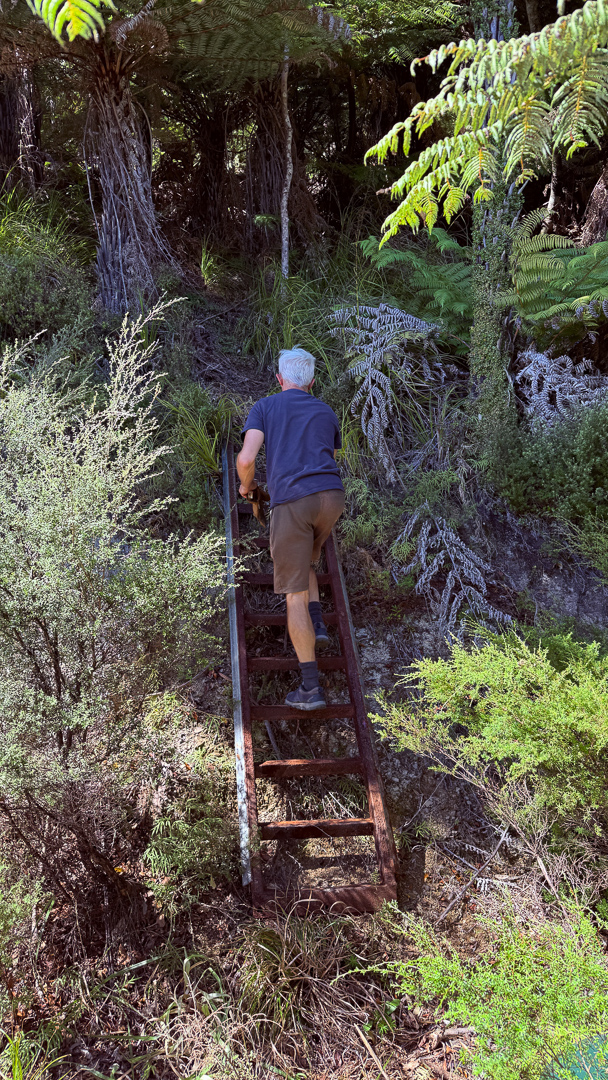 57. On installe une vieille echelle pour nous donner un acces aux sentiers en amont de la maison.