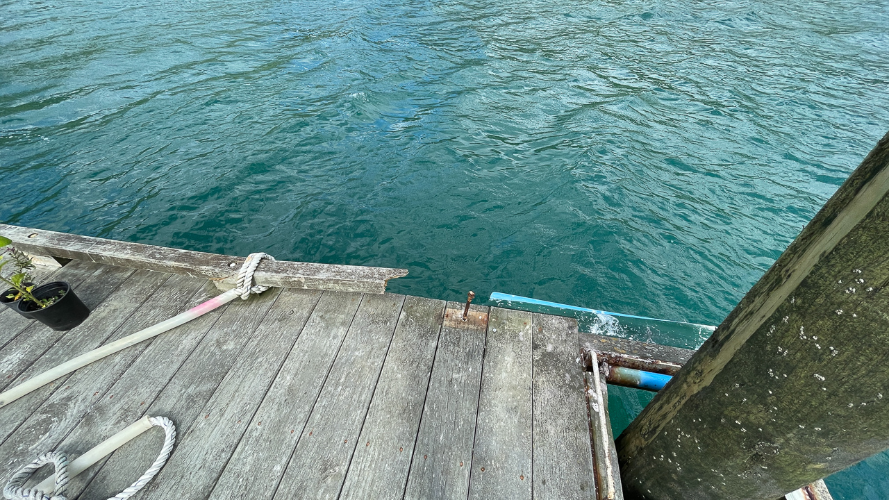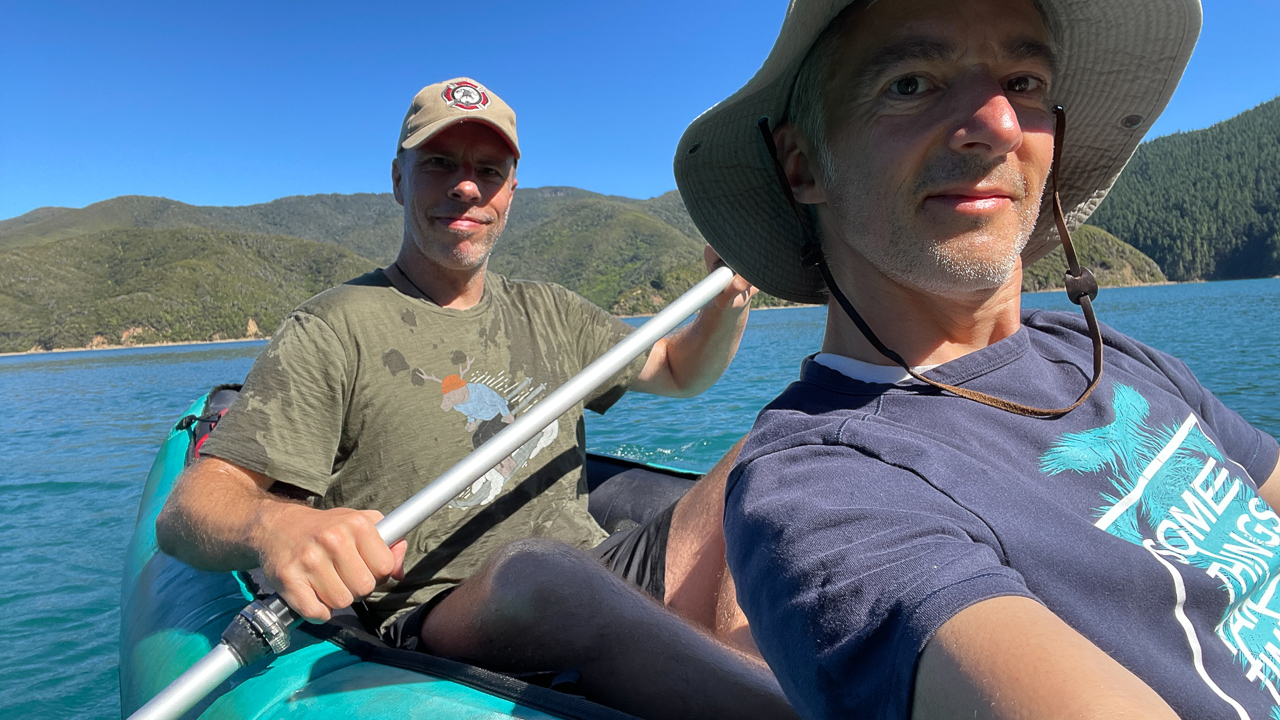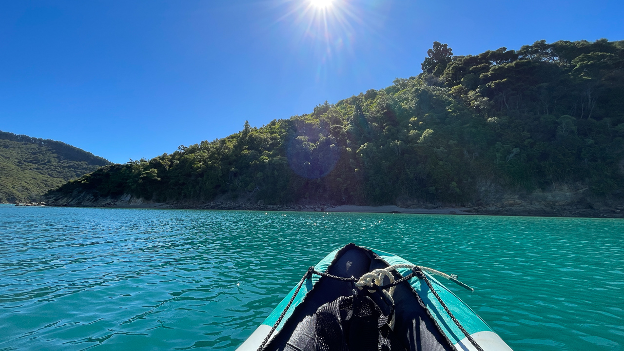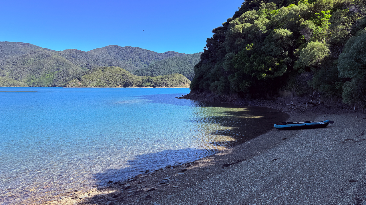 59. On n'a pas de bateau et mon genou me fait mal. Du coup, on decide de se rentre a cette plage, de l'autre cote de la baie, en kayak.
