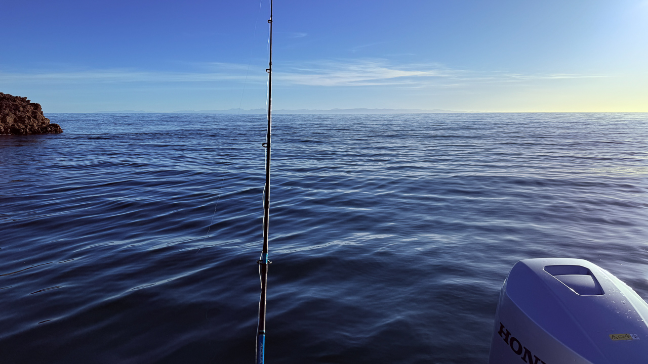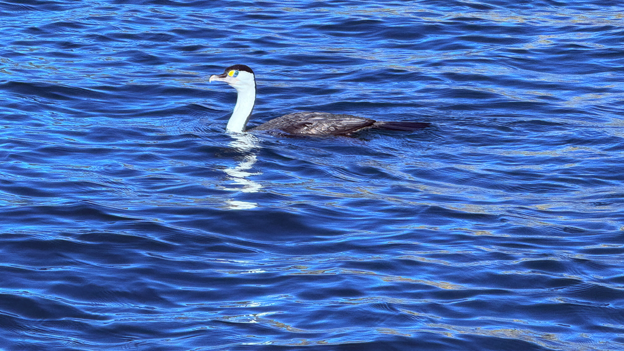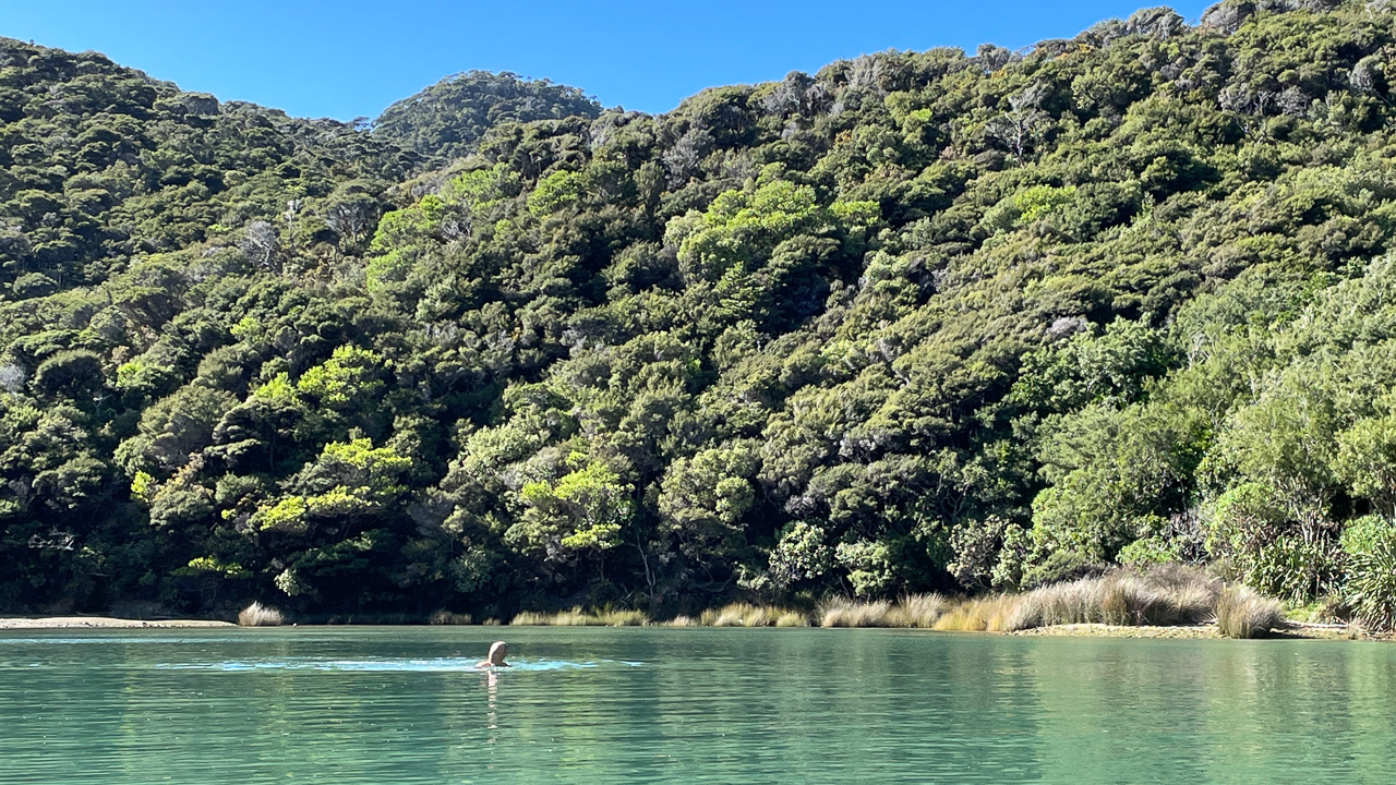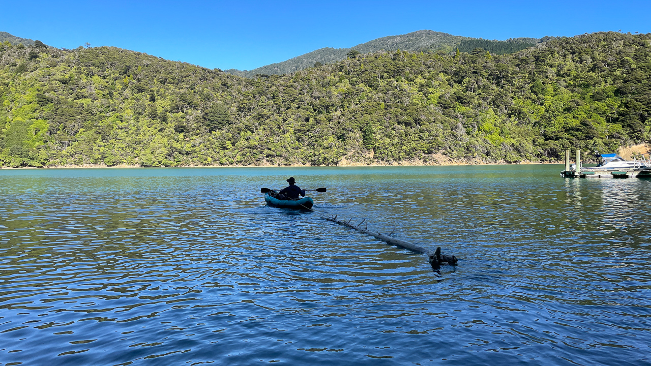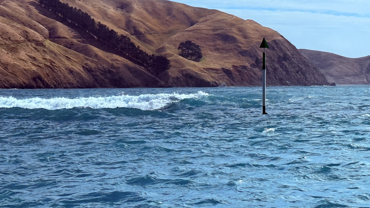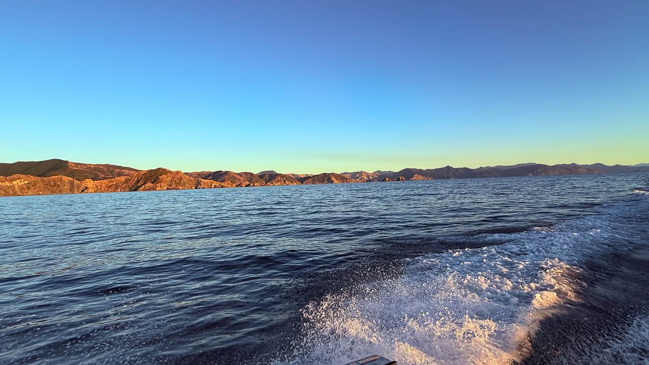 32. Apres une heure et demi a chatouiller les blue cods, on se met en route pour la grande plage afin de s'y baigner ... mais on croise un banc de kahawais. On lance une ligne de traine et ...