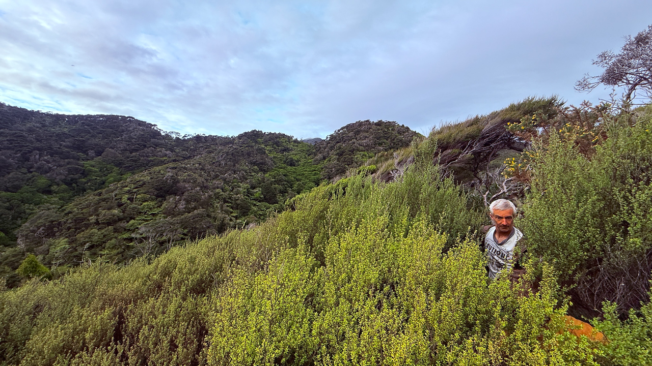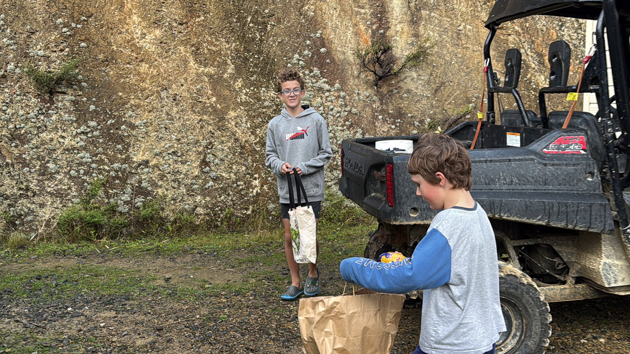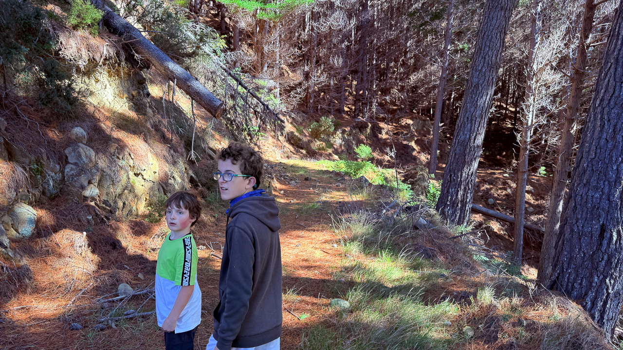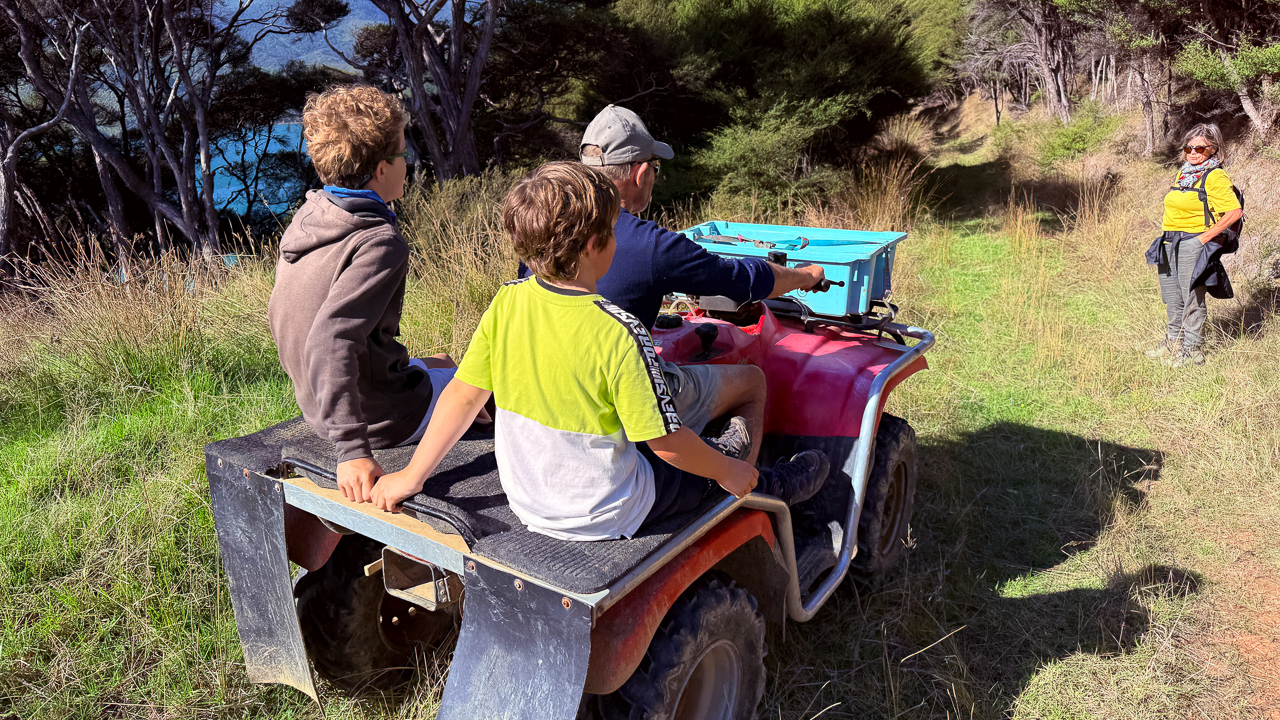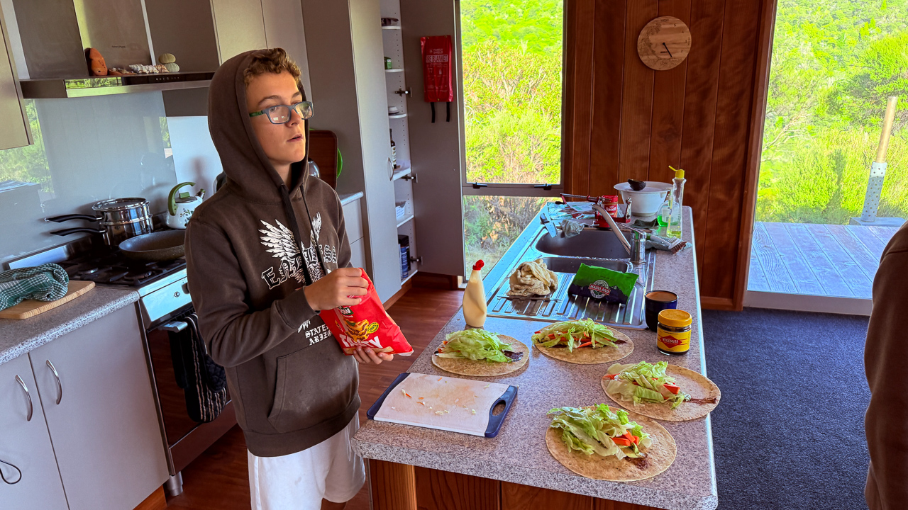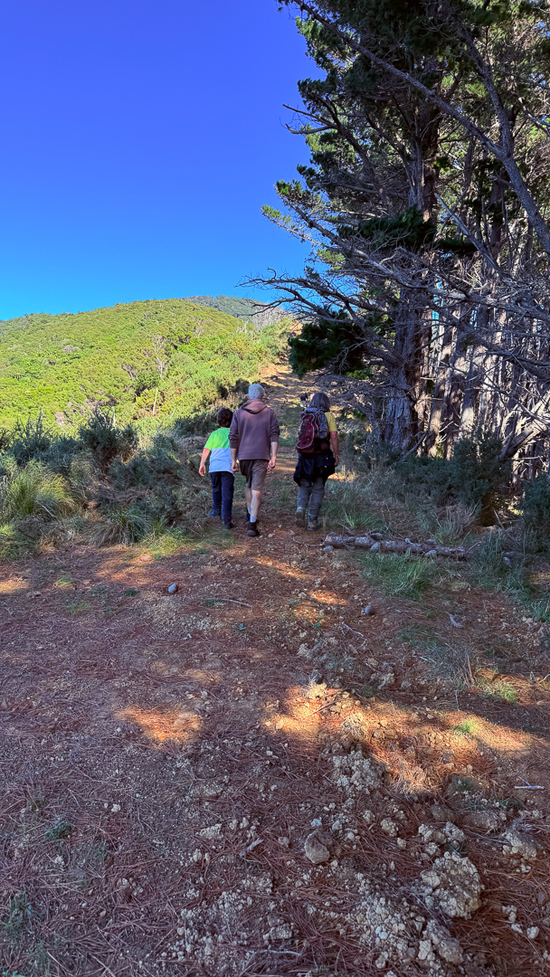168. Aujourd'hui, nous avons ete invites par Gil et Guy pour faire une marche sur leur terrain. Ils ont pas mal de pistes et ca devrait nous permettre de nous donner d'autres points de vue sur l'ile. On a besoin d'un pique-nique et ca tombe bien: Wellington College a demande a ses etudiants de cuisiner un menu pour leur famille! C'est donc Adan qui s'y colle!