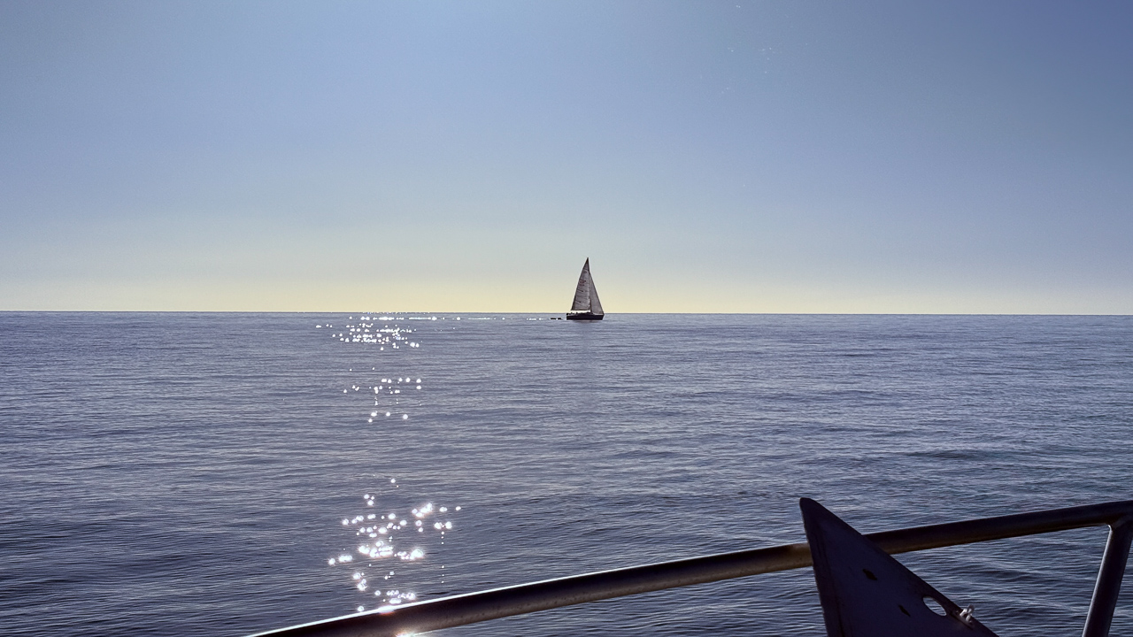 58. Ken et Rebecca nous ont offert, en Janvier, un petit bateau a voile en verre colore. Il trouve sa place, tout naturellement, au dessus de la carte marine.