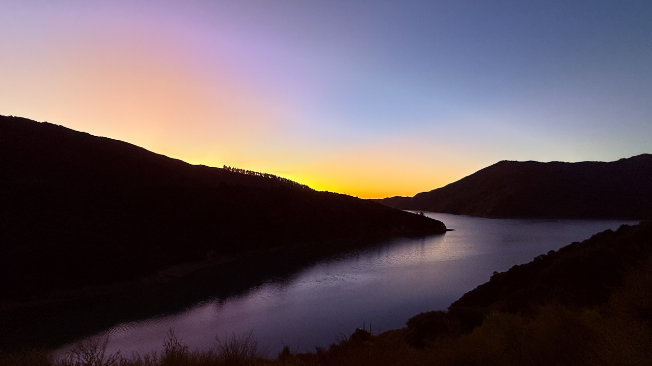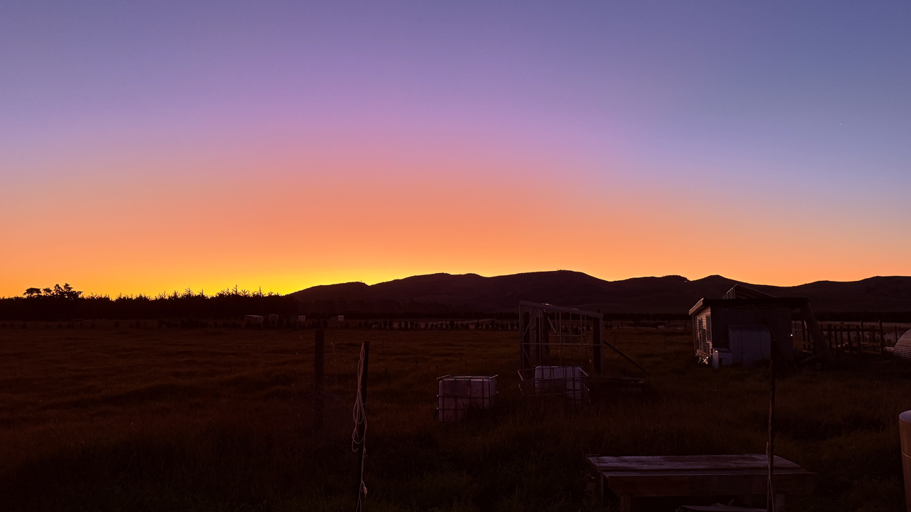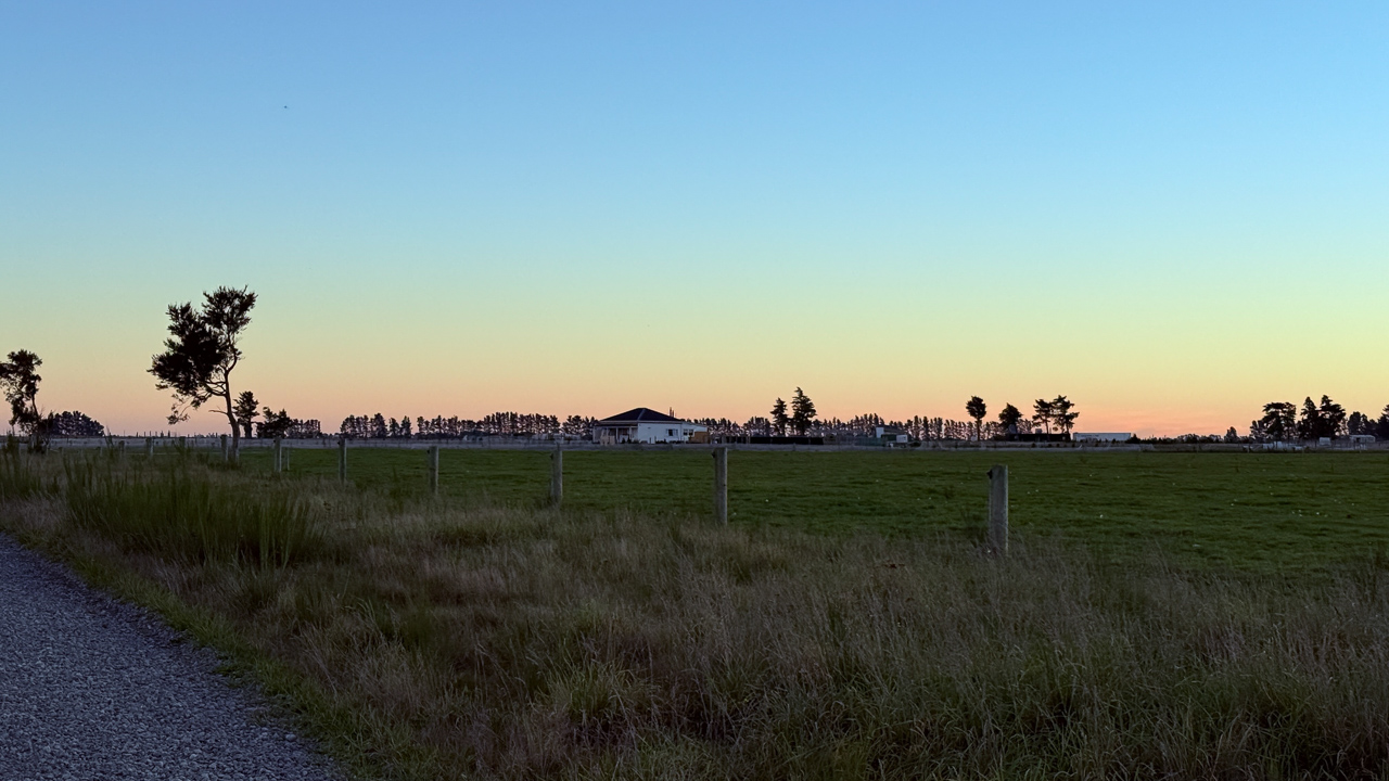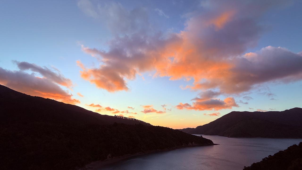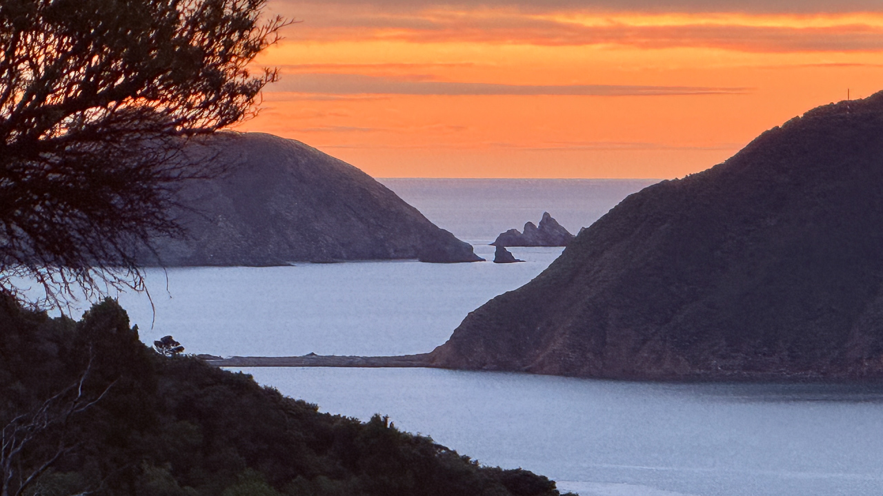 3. Sur la route de d'Urville, les couleurs se rechauffent avec la tombee du jour. Au loin, la silhouette du Taranaki se detache de l'horizon.