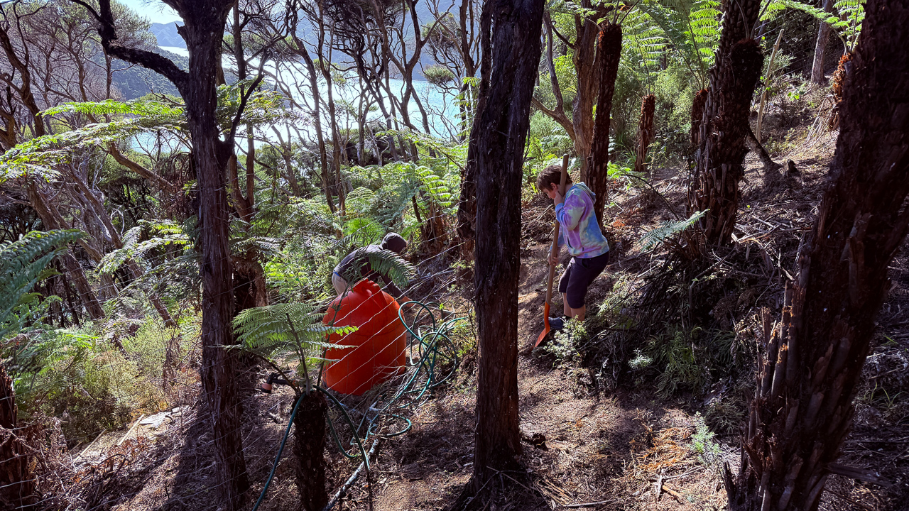 126. Lundi de Paques. Graeme passe un bout de matinee avec nous pour placer un filet.