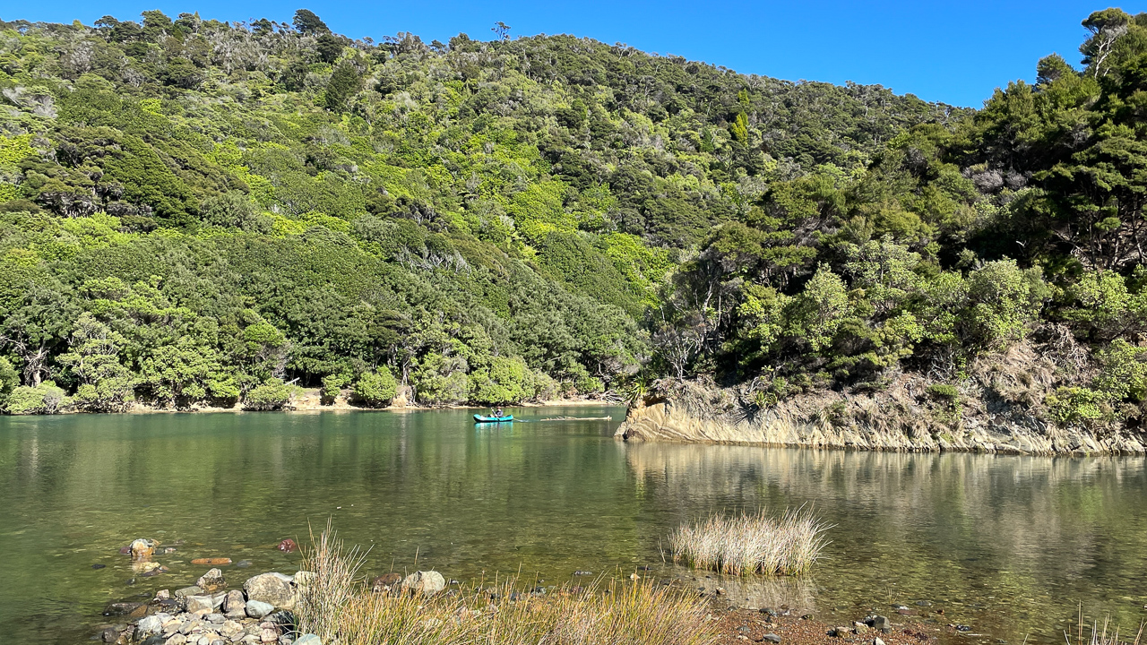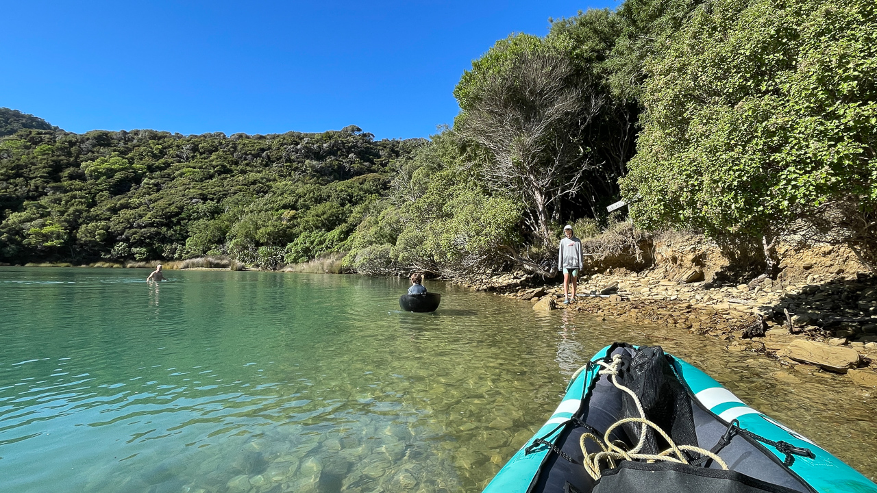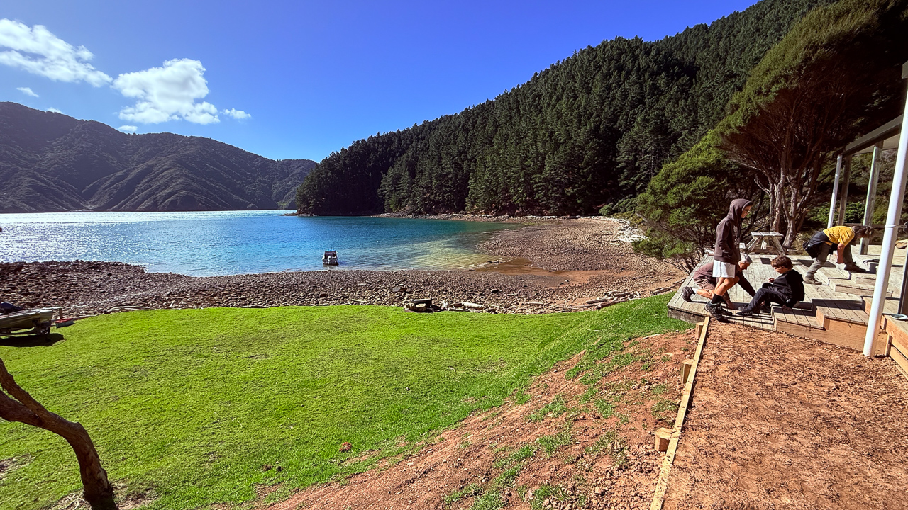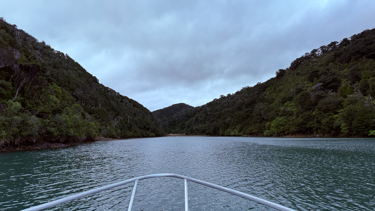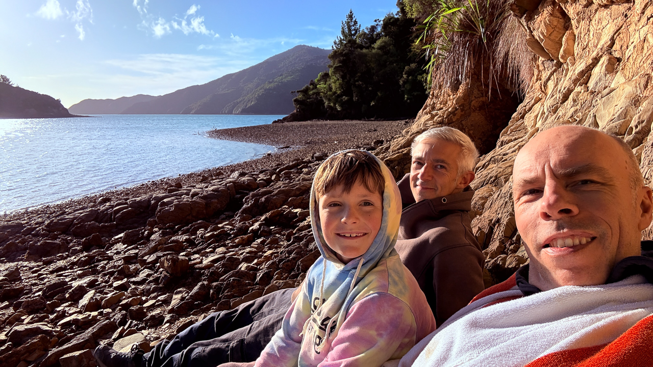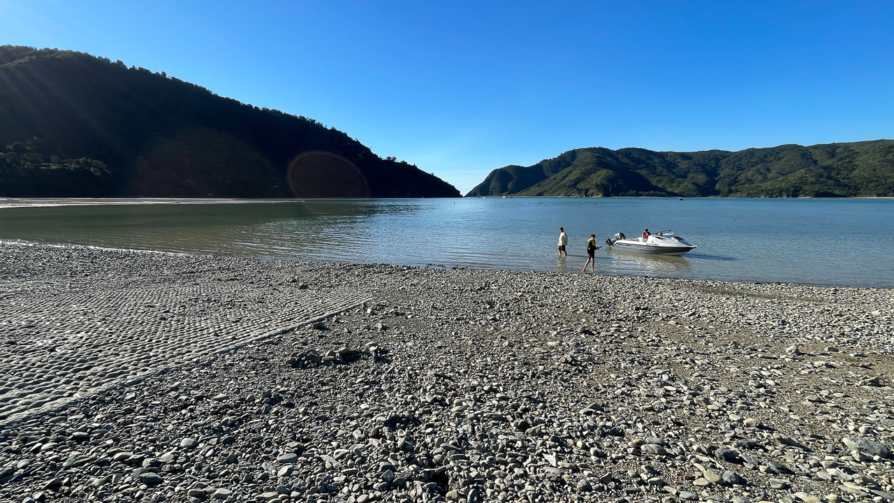 2. ... mais nous arrivons a Okiwi Bay en milieu d'apres-midi, et coincidence, la maree est tres, tres basse. On doit attendre qu'elle remonte pendant une heure et demi pour pouvoir mettre le bateau a l'eau.