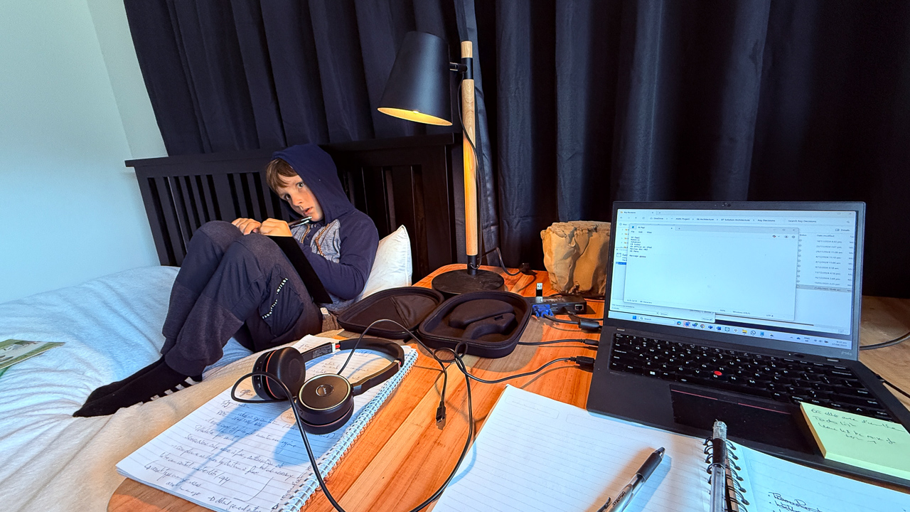 85. Jeudi. Pendant que je travaille un peu, Cosmo ecrit son journal.