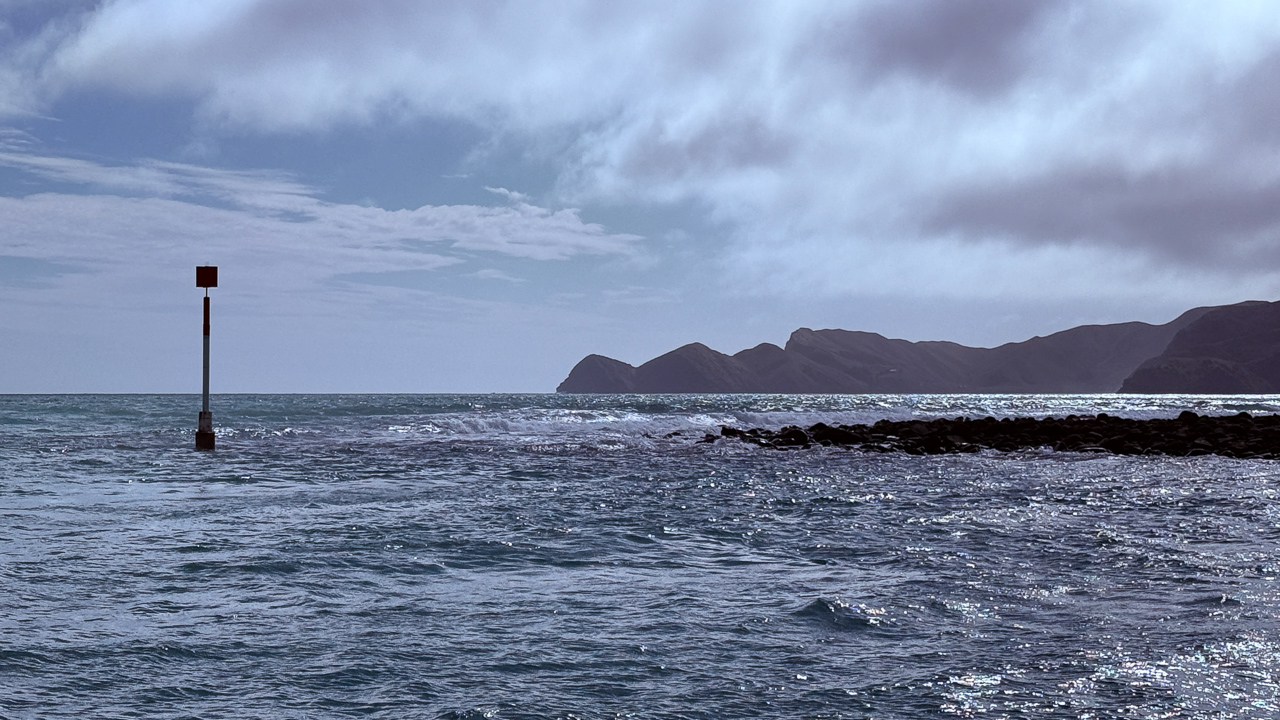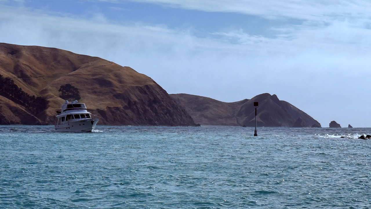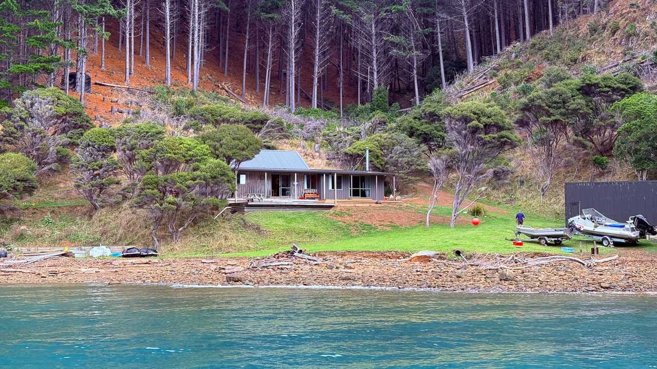 182. Au poteau qui soutient le cable enjambeant le chenal, Guy nous apprend que c'est lui qui l'a installe. A l'epoque (il y a 30 ans), c'etait le seul moyen d'approvisioner le Nord de l'Ile en electricite. Aujourd'hui, seule une maison en beneficie, et le cable sera bientot demonte, grace a l'avenement du solaire.