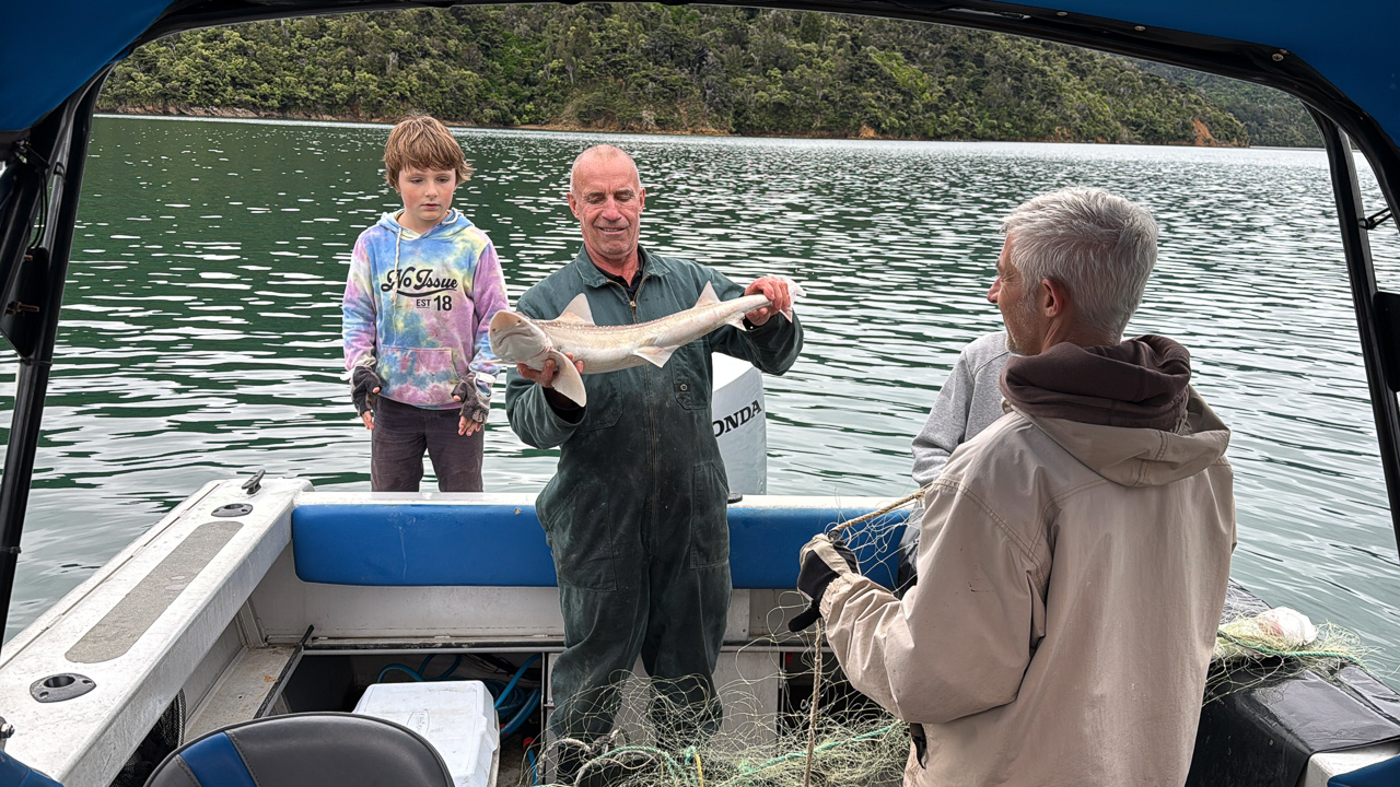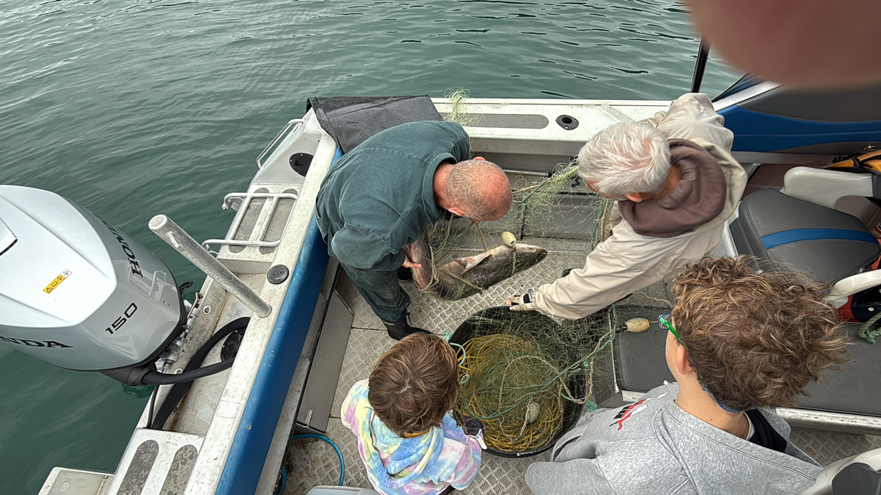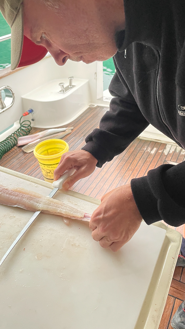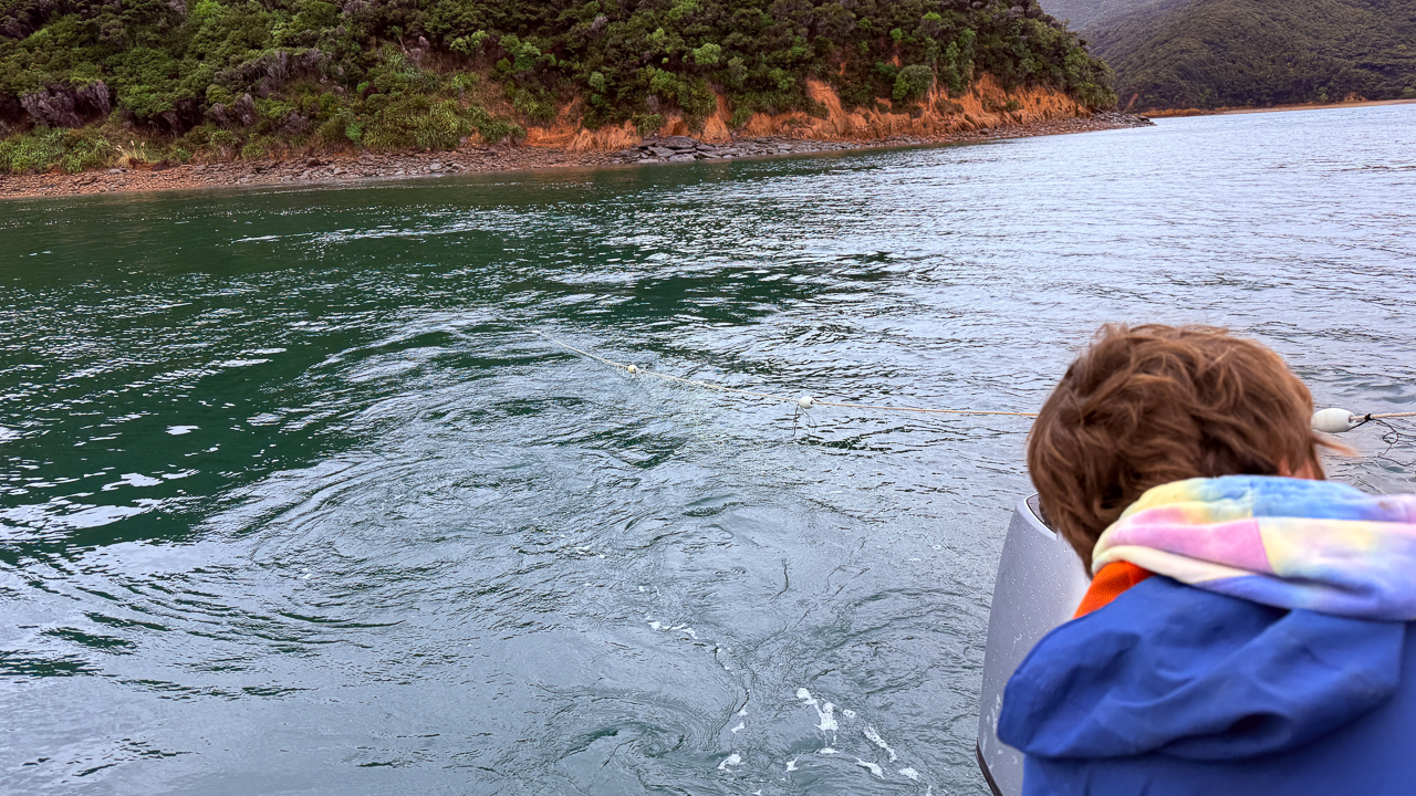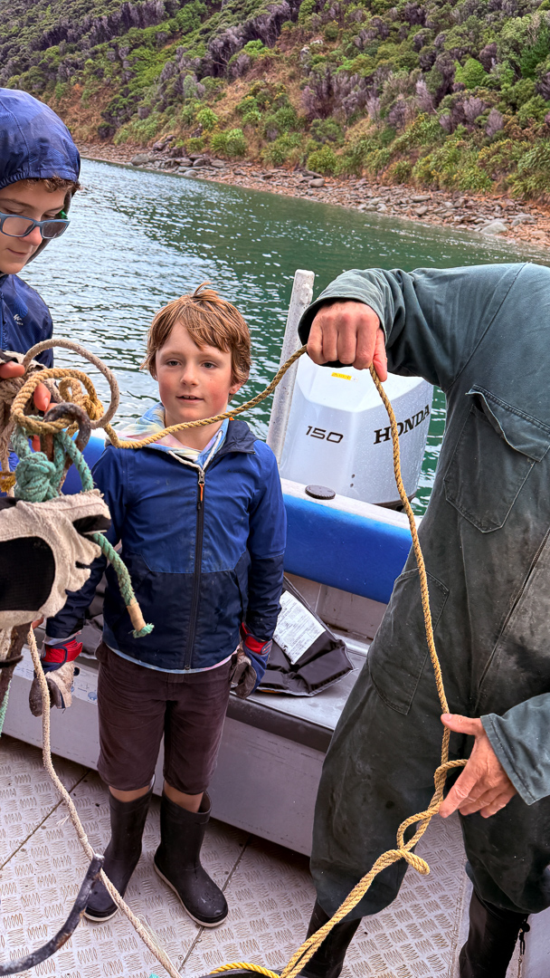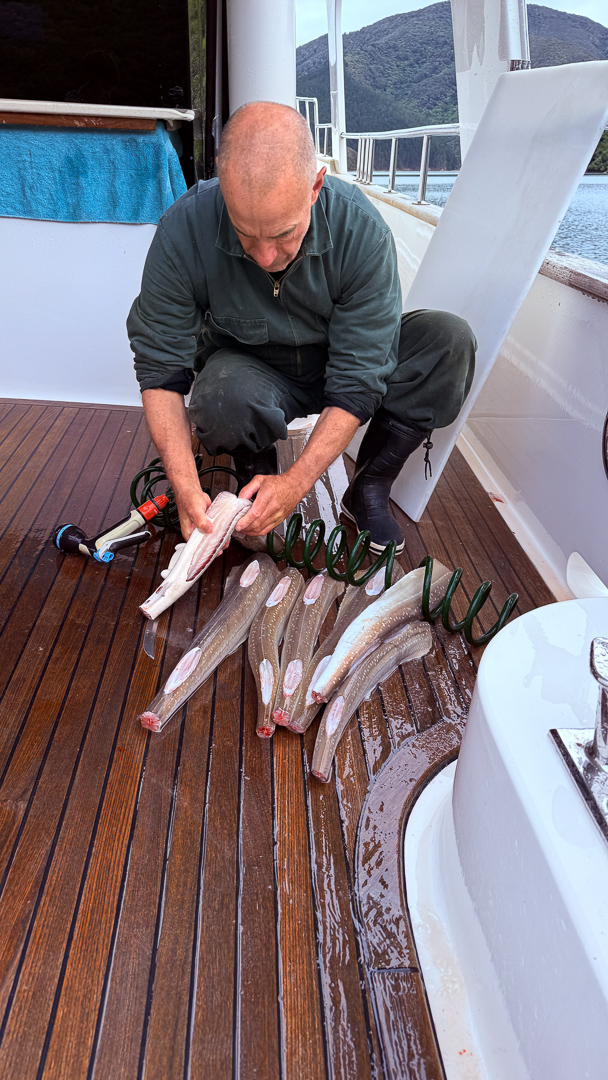 141. Une fois le filet completement remonte, Graeme nous convie sur son bateau pour filter tout ca. On se met a bord ...