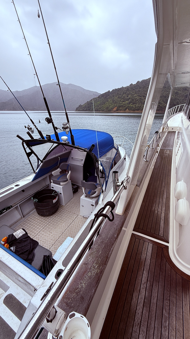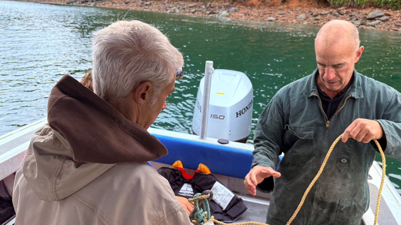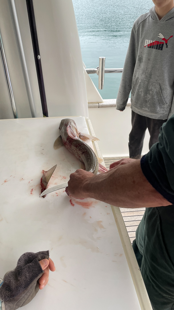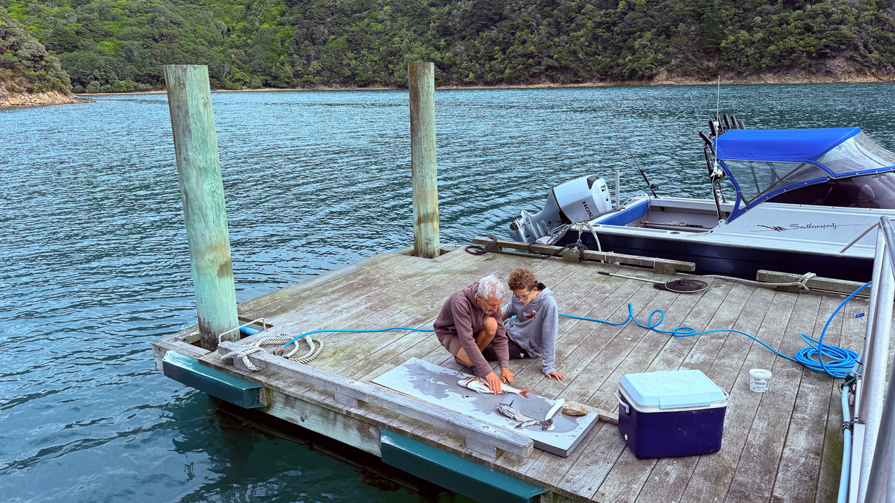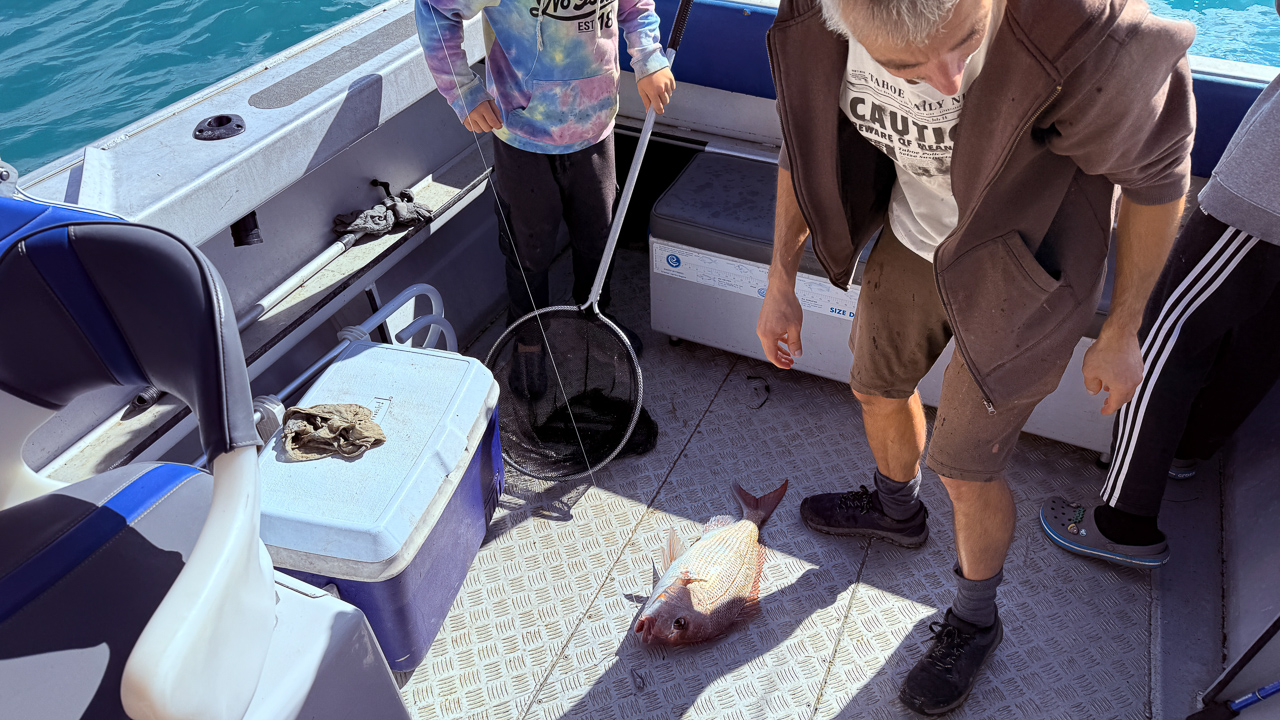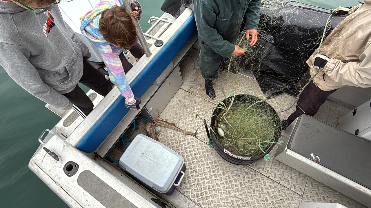 141. Une fois le filet completement remonte, Graeme nous convie sur son bateau pour filter tout ca. On se met a bord ...