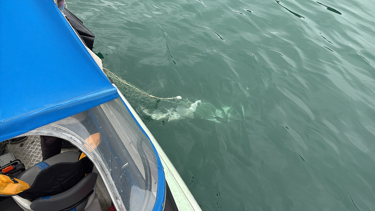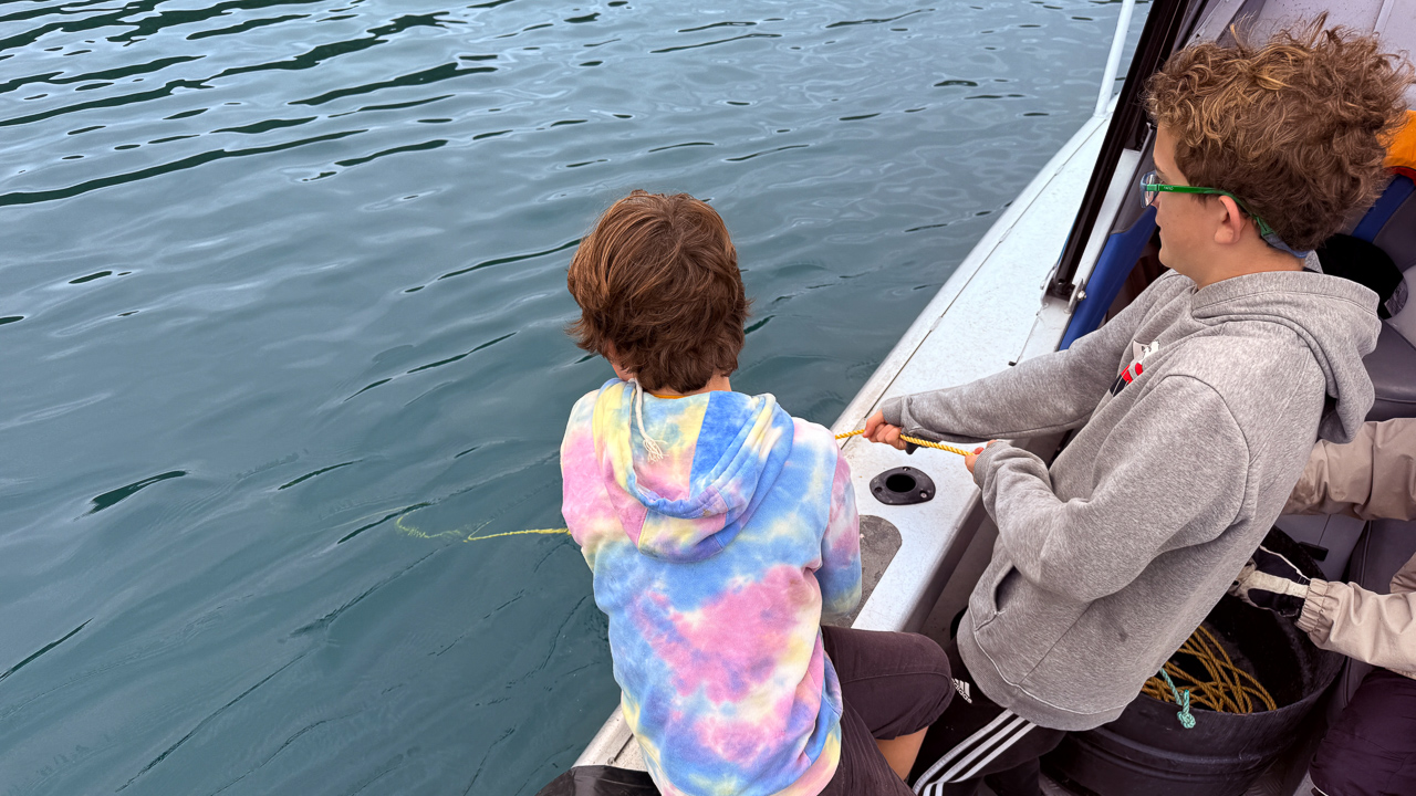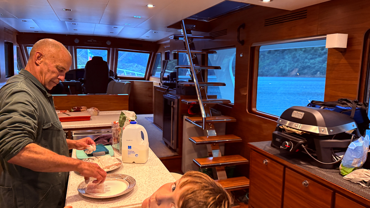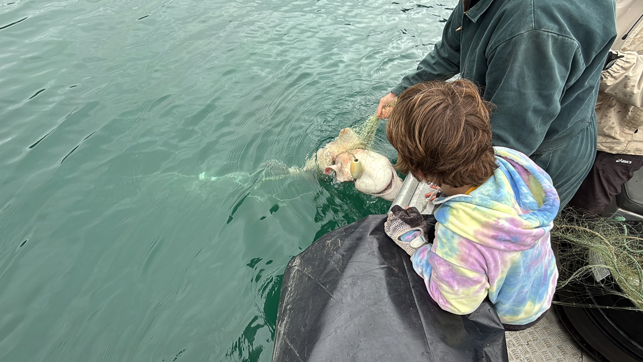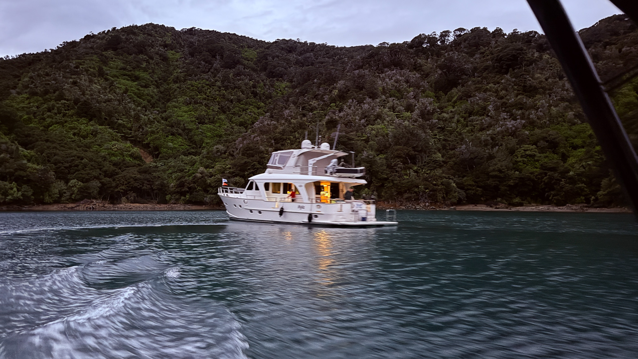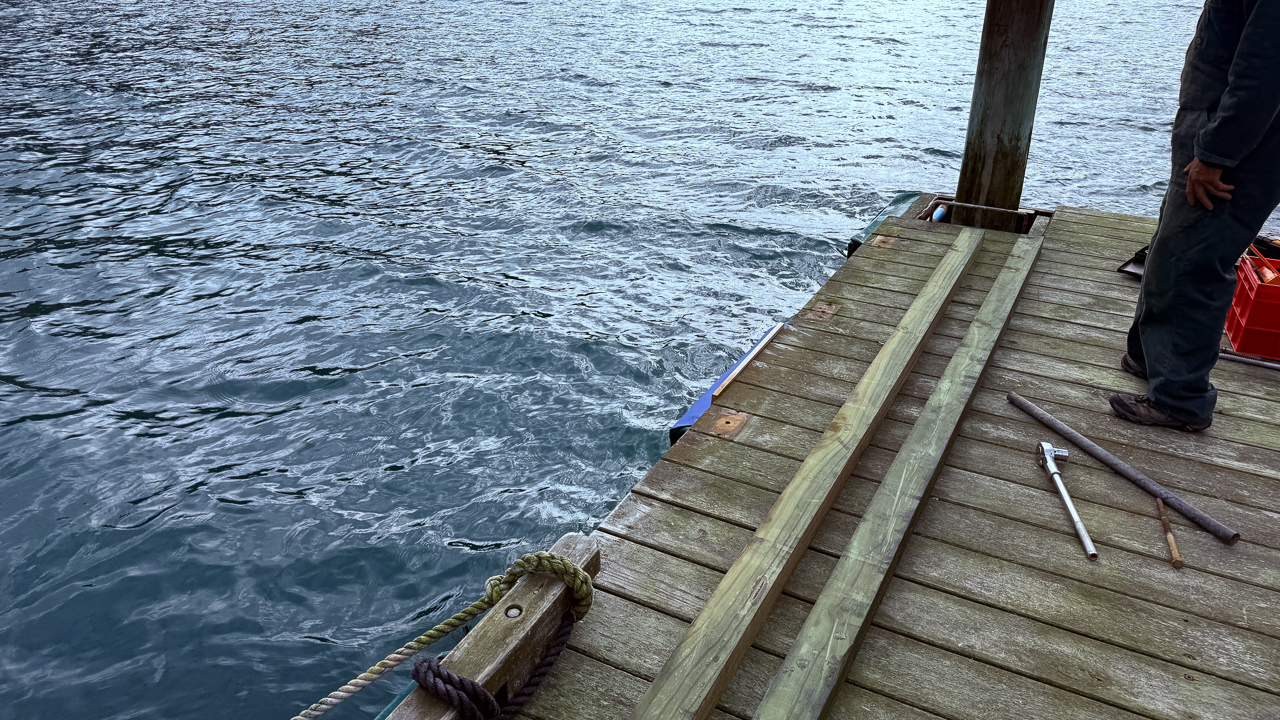 141. Une fois le filet completement remonte, Graeme nous convie sur son bateau pour filter tout ca. On se met a bord ...
