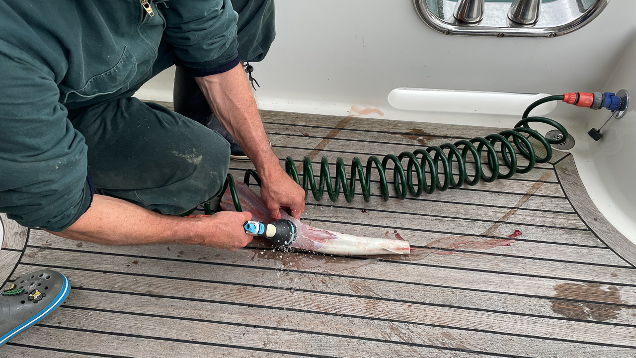 143. Ici, on nettoie le sange a l'interieur du poisson en utilisant sa tuyauterie interne.