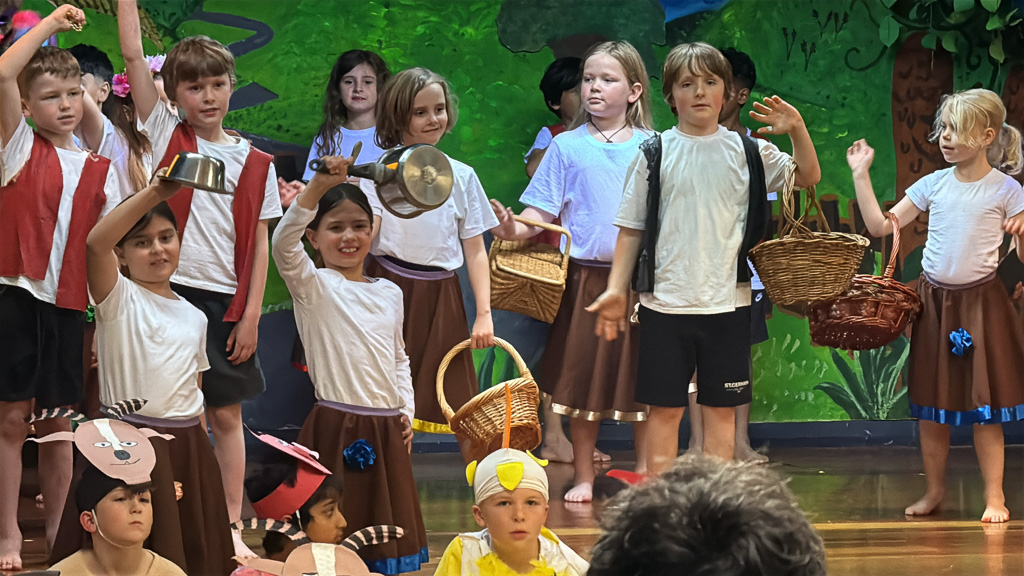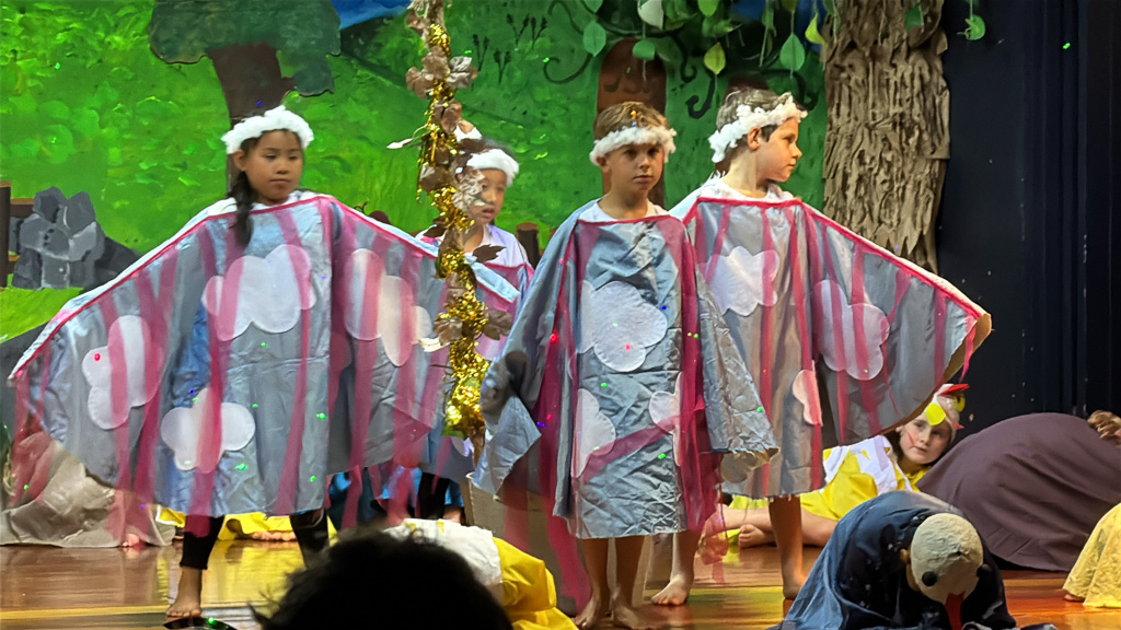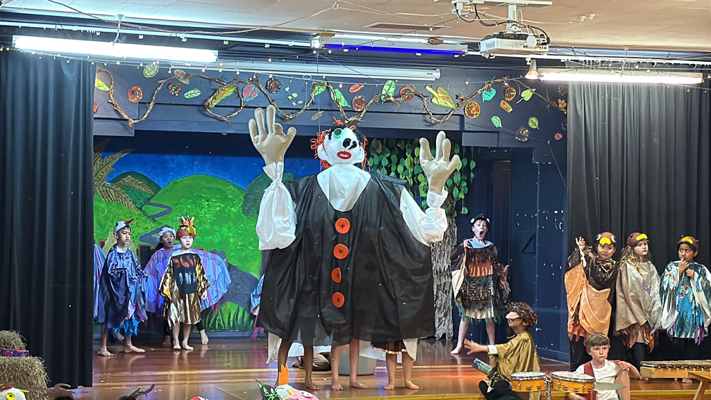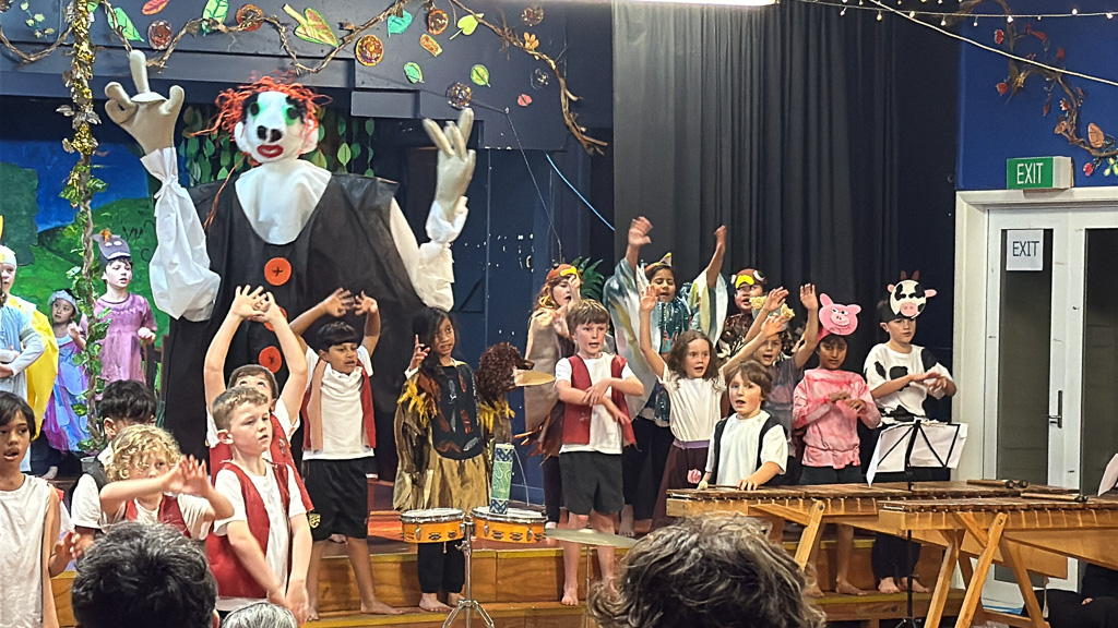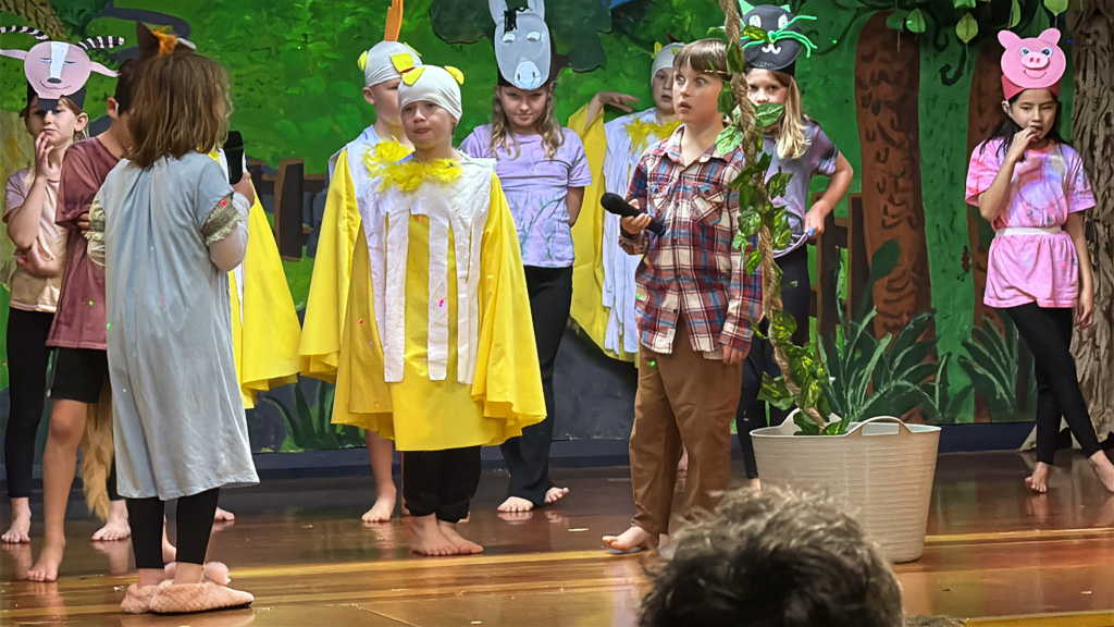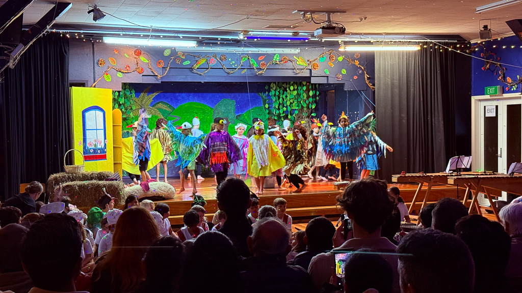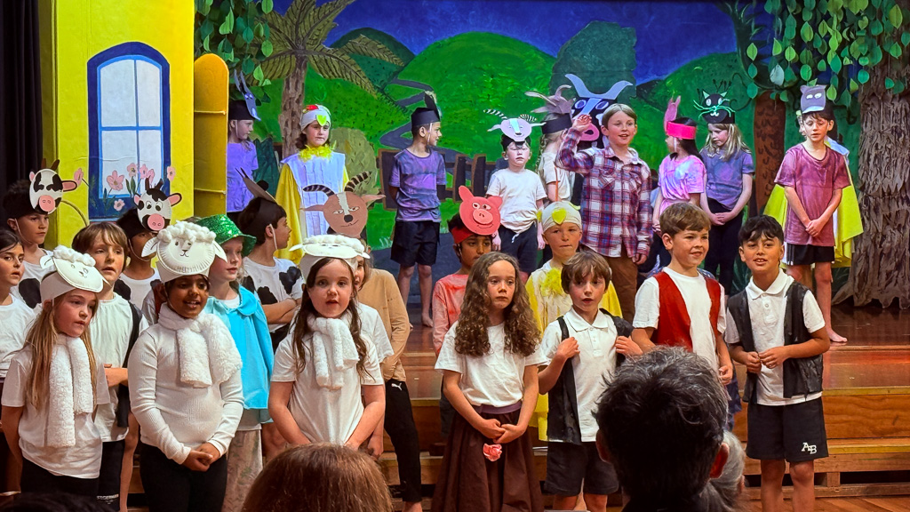 Le spectacle etait en preparation depuis des mois. Les parents, les profs, et surtout les enfants y avaient travaille quotidiennement, jusqu'a cette semaine. Le syndicat Kowhai a presente "Jack and the Bean Stalk", une version adaptee a l'air du temps, et pour des enfants de 8 ans. Ils ont fait 4 representations de 45 minutes, etalees sur 4 jours. Cosmo etait a fond, a profite de chaque seconde, et etait decu, a la fin, que tout ca soit fini. Pour nous, c'etait formidable de le voir avoir tant de plaisir. Une fois de plus, nous avons ete ebahis par MNS et par l'environnement exceptionnel qu'ils creent pour les enfants.