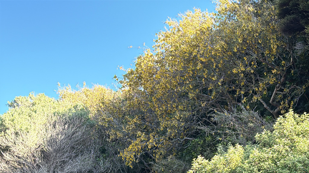 9. Comme je l'esperais, les kowhais sont en fleurs. Ils attirent une quantite considerable de tuis qui creent un fond sonore continue de chants.