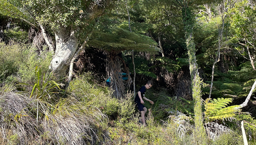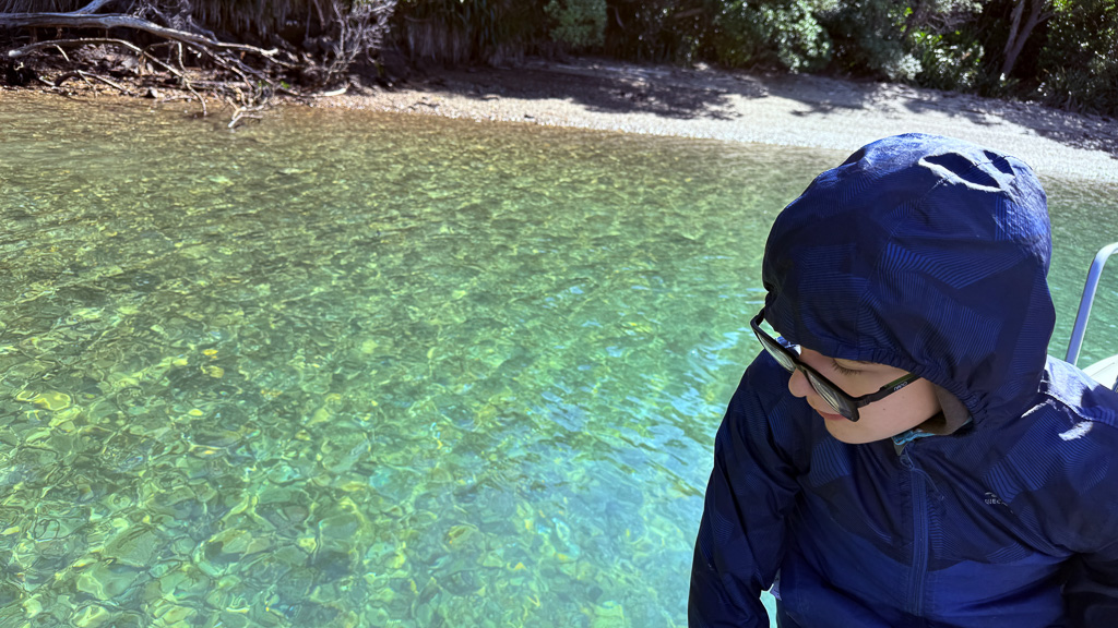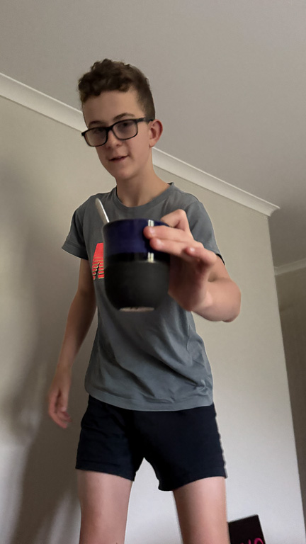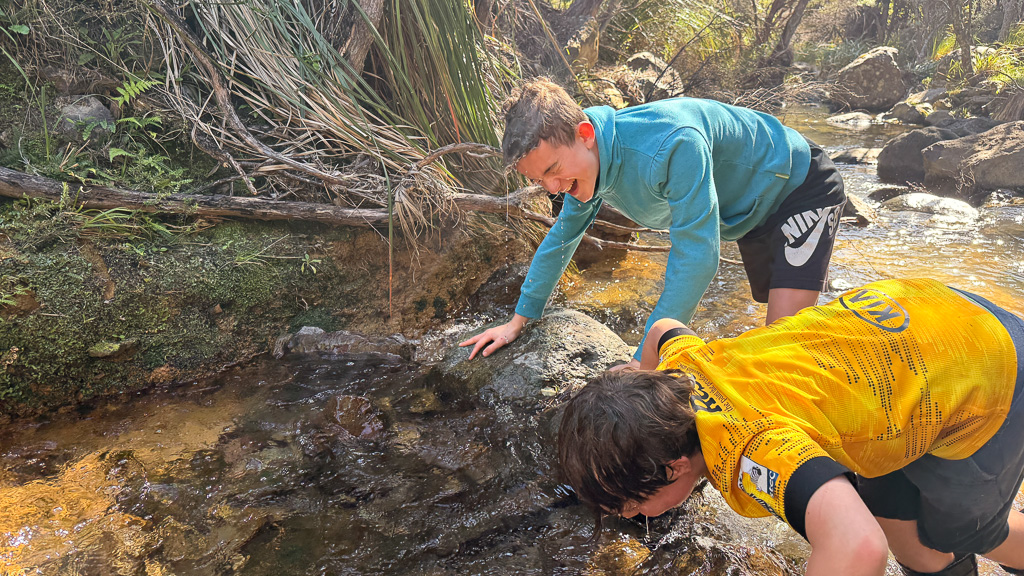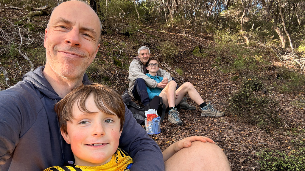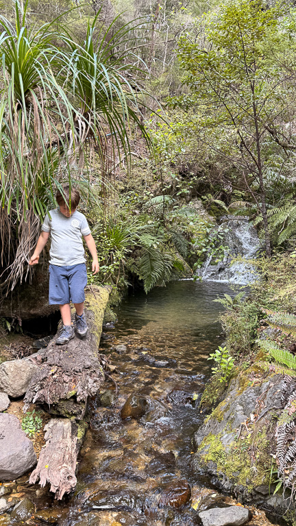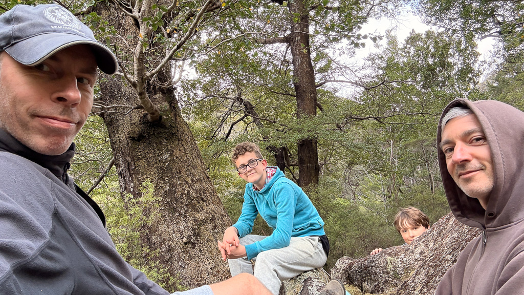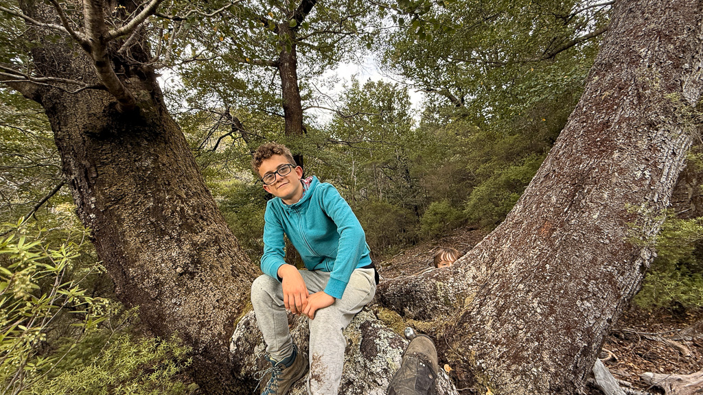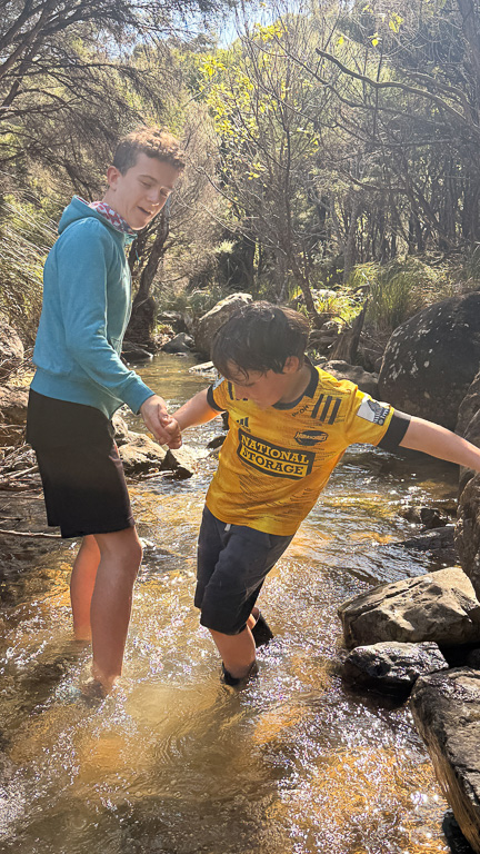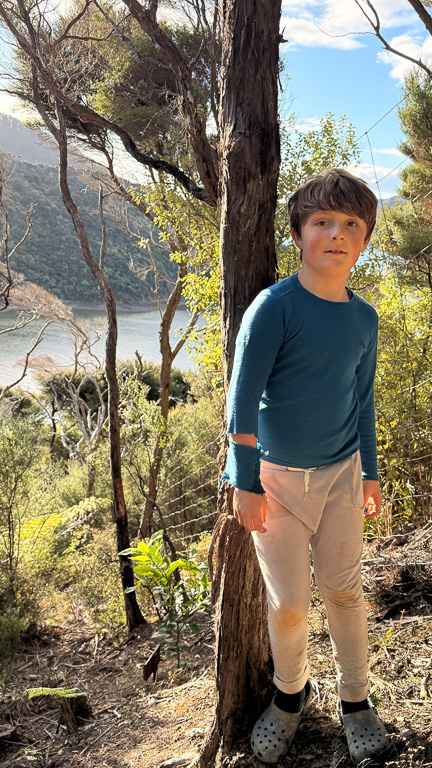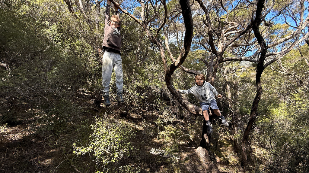 85. Les enfants sont partis avec un talkie-walkie pour se promener, a la recherche d'un nouveau baton de marche pour Cosmo. Adan m'appelle et me demande de venir les voir depuis le deck. Bien sur, ils sont beaucoup plus loin que ce que j'avais imagine. D'un cote, je suis un peu anxieux de les voir si loin, mais ils passent aussi un moment privilegie ensemble. Alors, a leur retour, on reitere les consignes de securite.