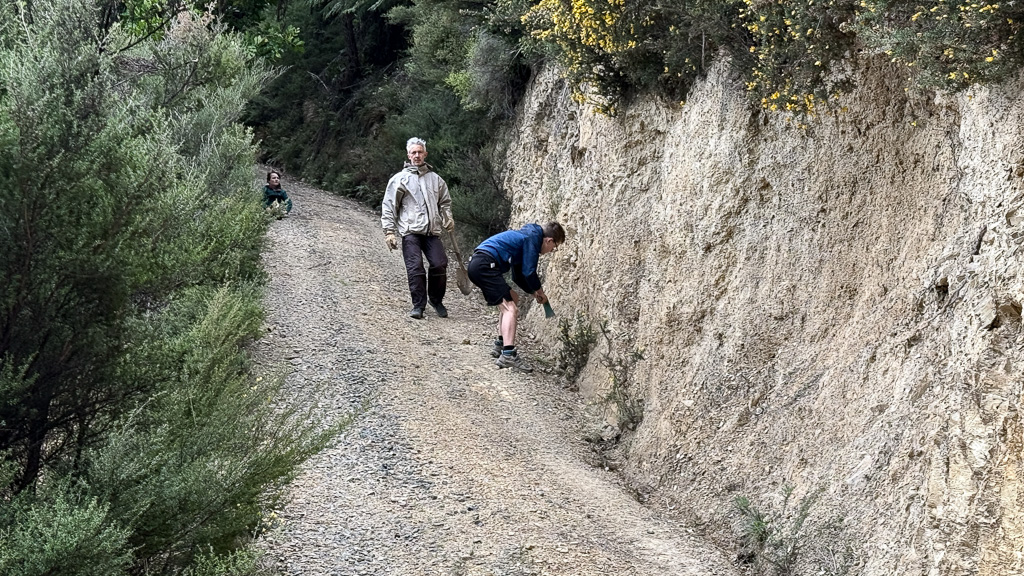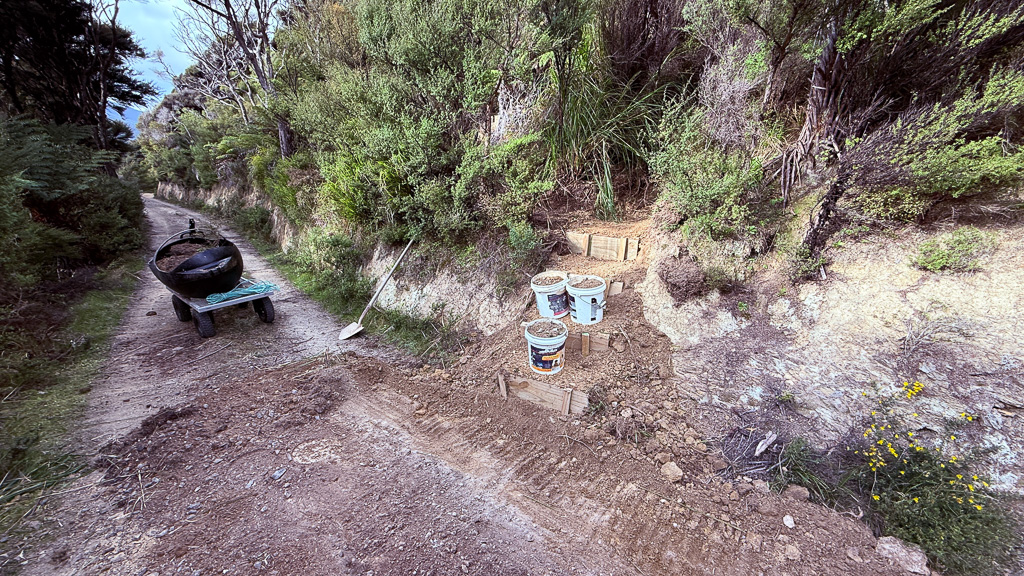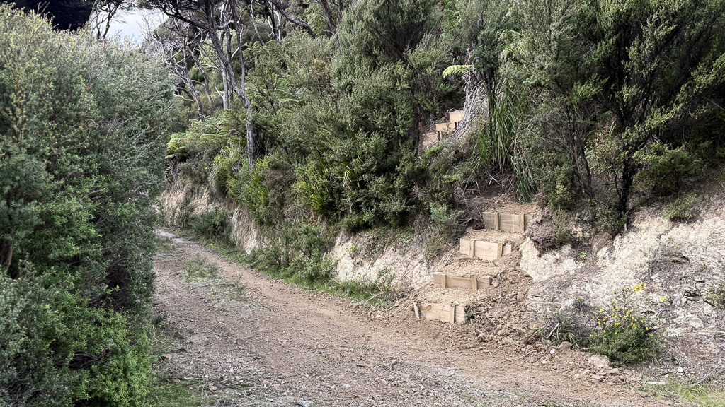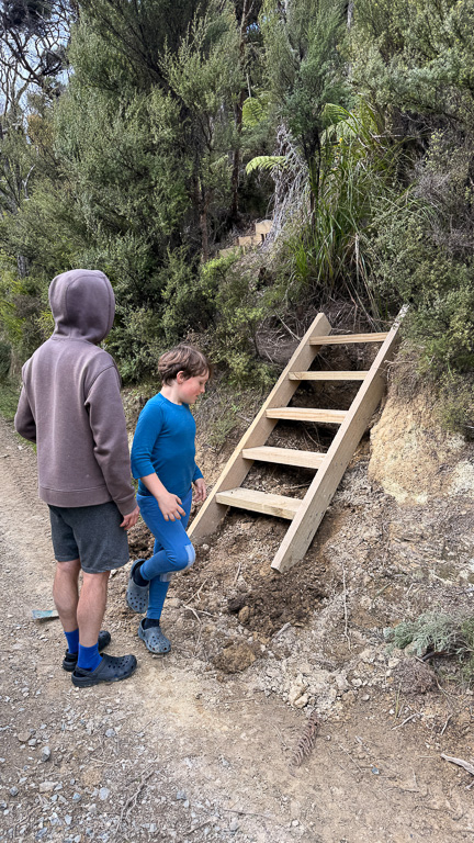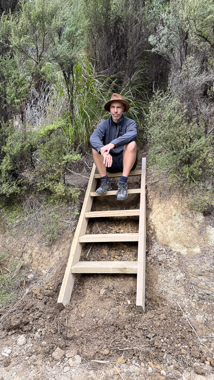70. Les marches fabriquees il y a quelques hours pour acceder au verger n'ont pas tenu une semaine! On les remplace vite fait par un escalier.