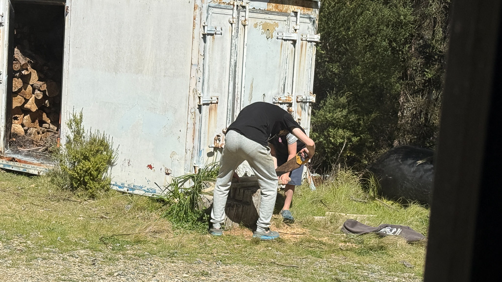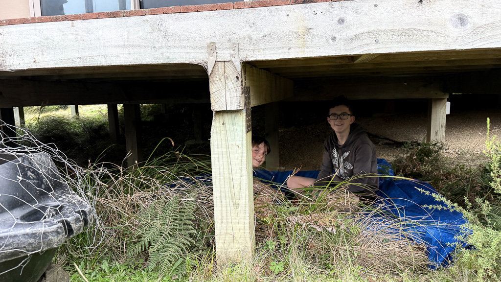 33. Les garcons construisent une petite cabane sous le deck, dans laquelle ils prendront un gouter.