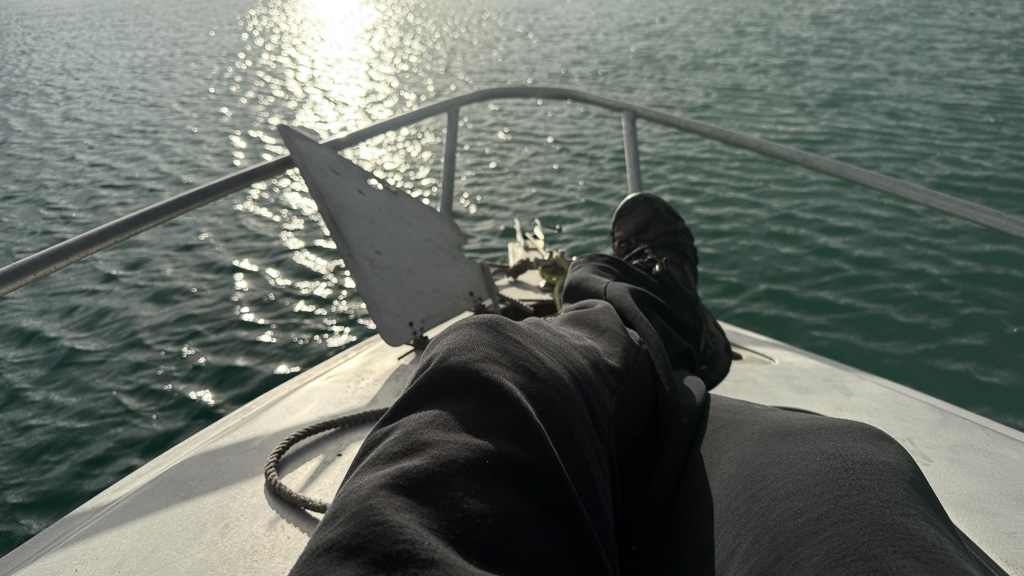 64. Apres le cafe avec Trevor, on essaye d'aller pecher dehors, mais la houle est encore bien trop forte.