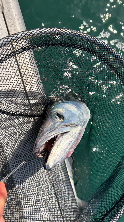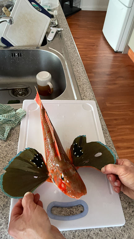 57. Les enfants etaient au ponton pour pecher. Ils sont remontes avec un red gurnard attrape par Cosmo et termine par Adan.