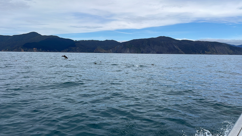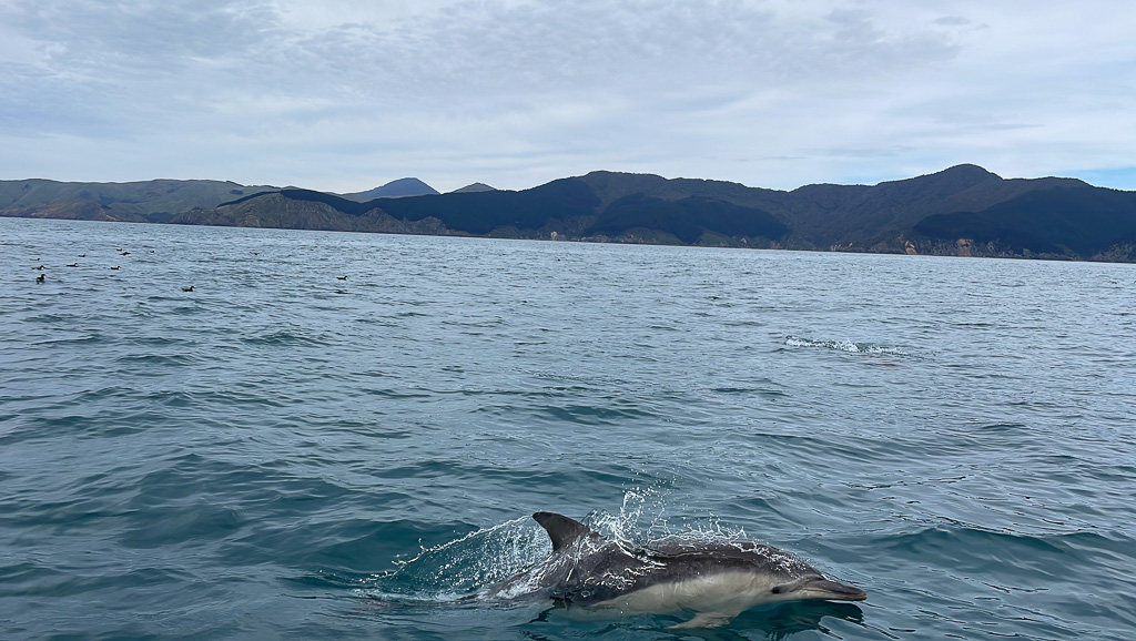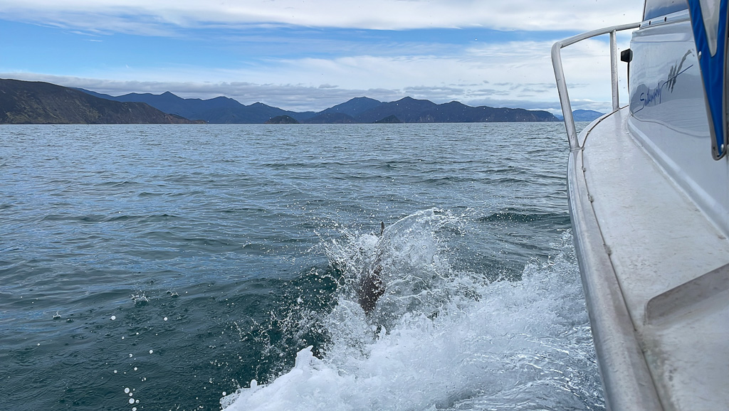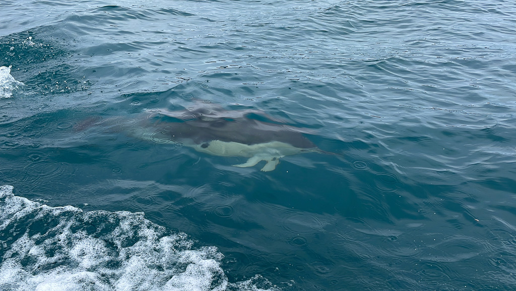 95. Les dauphins nous accompagnent pendant plusieurs minutes. Ils sont partout autour du bateau!