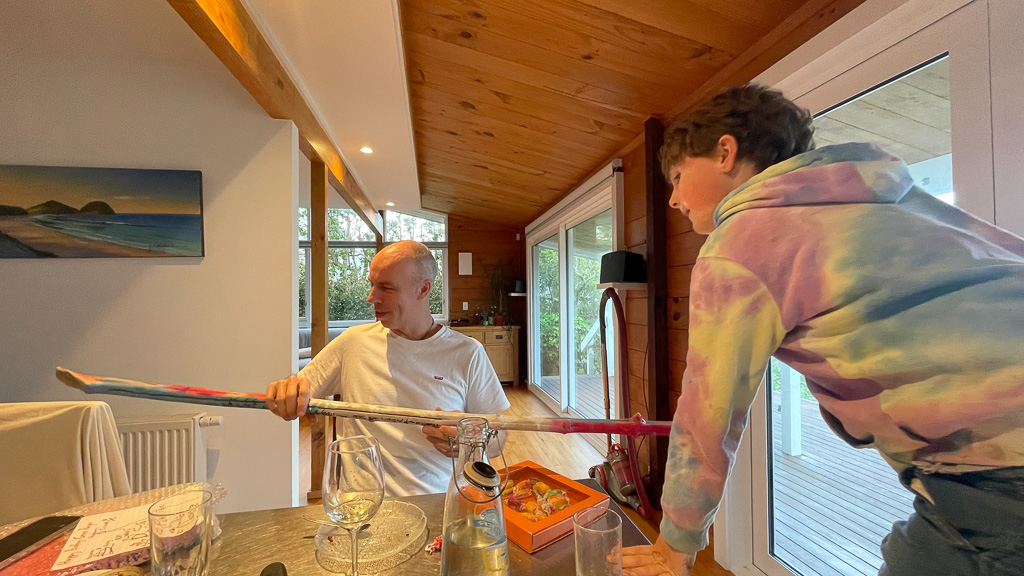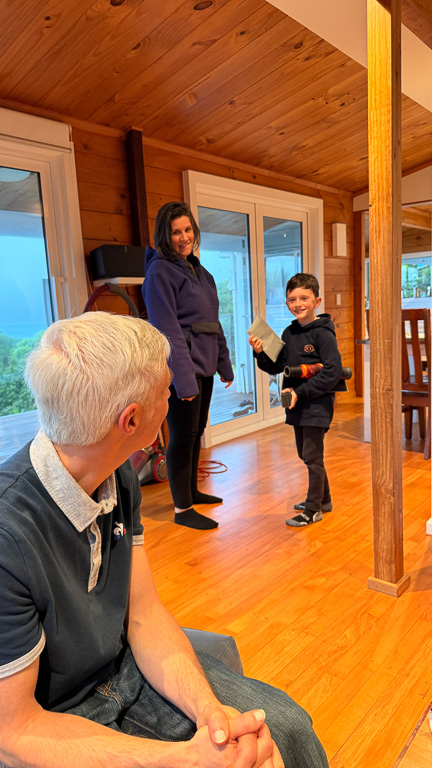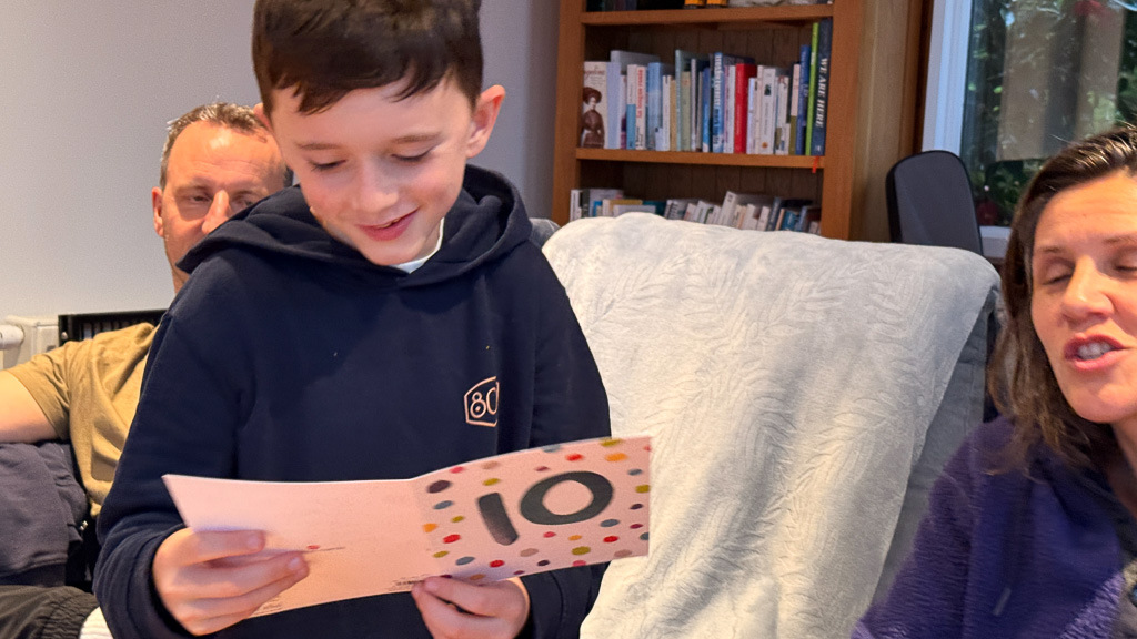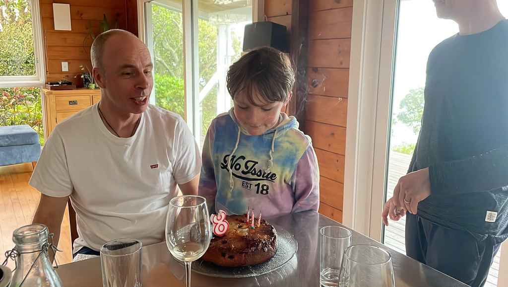 13. Hier matin, jeudi, les enfants avaient organise des croissants pour le petit dejeuner. Ce soir, vendredi, je viens a peine de refermer la porte apres le depart de Melissa qu'on frappe: c'est toute la famille qui debarque pour mon anniversaire! Pour moi, c'est une grosse surprise, mais pas pour Seb et les enfants!