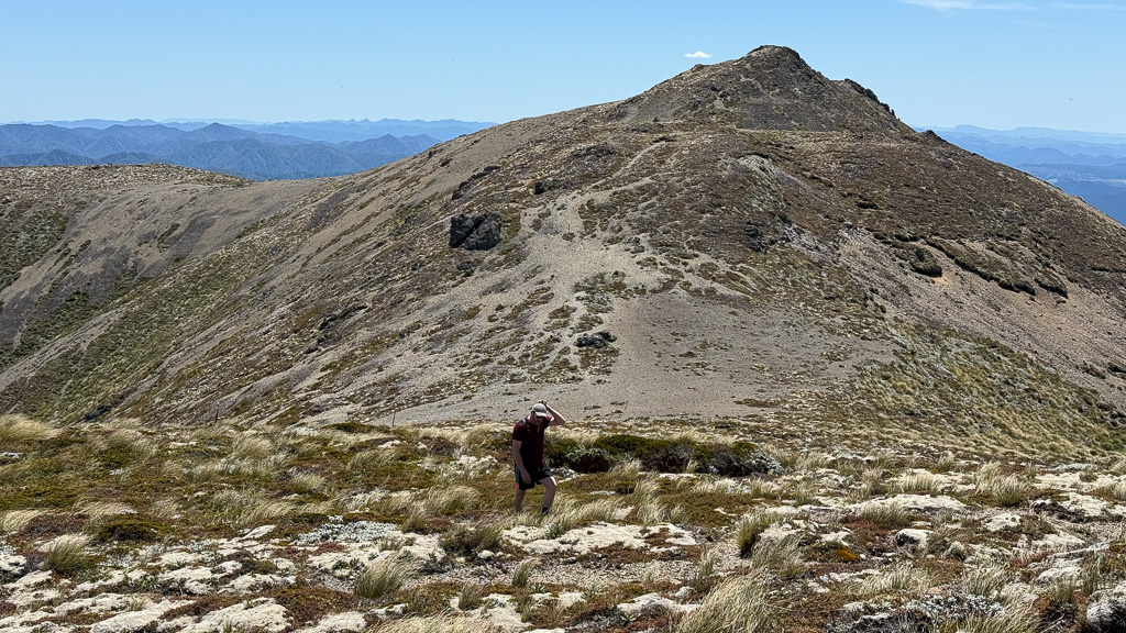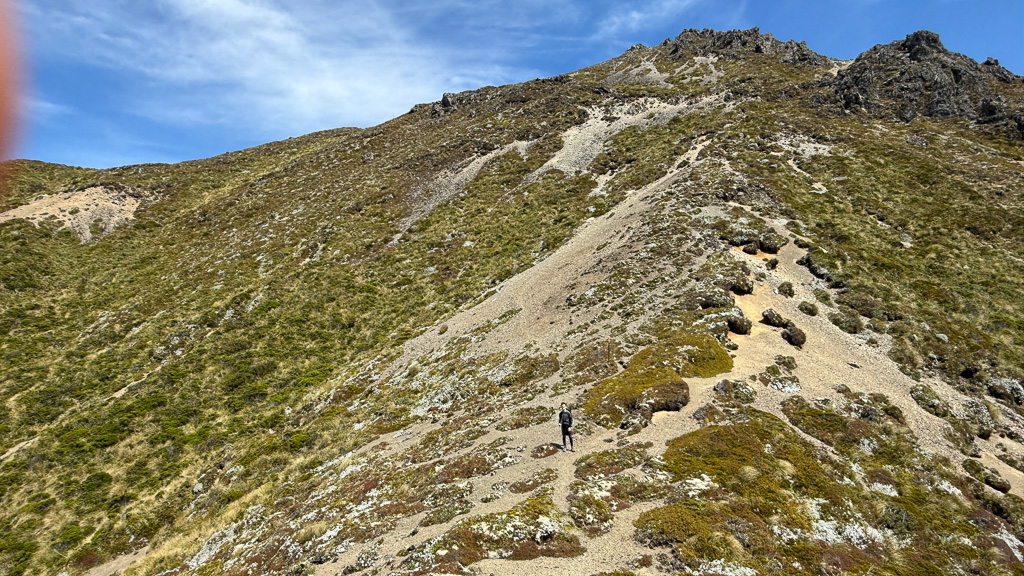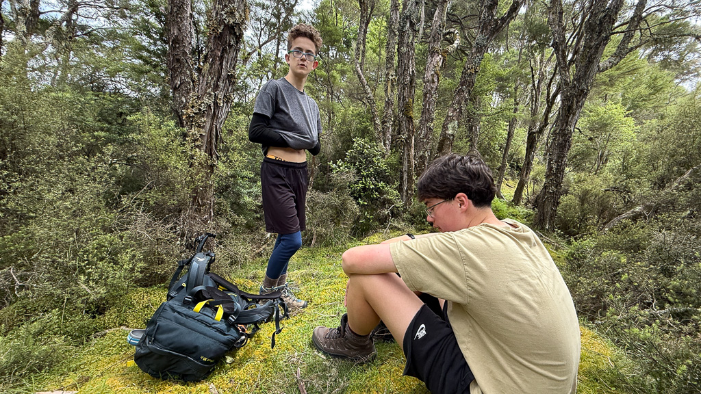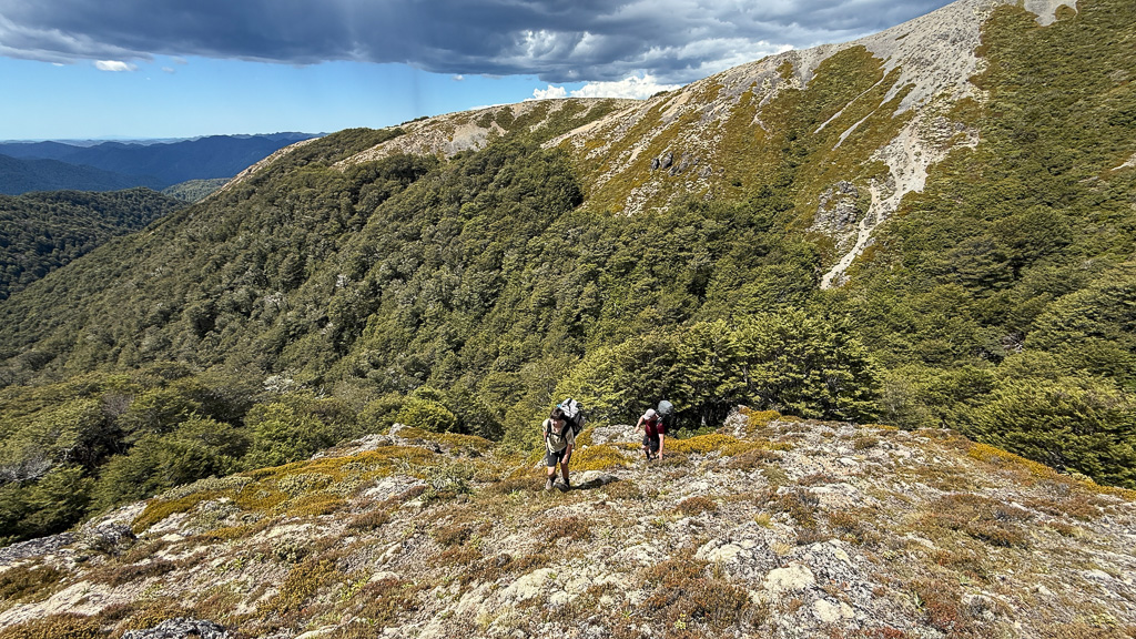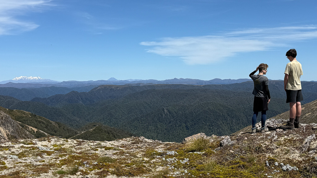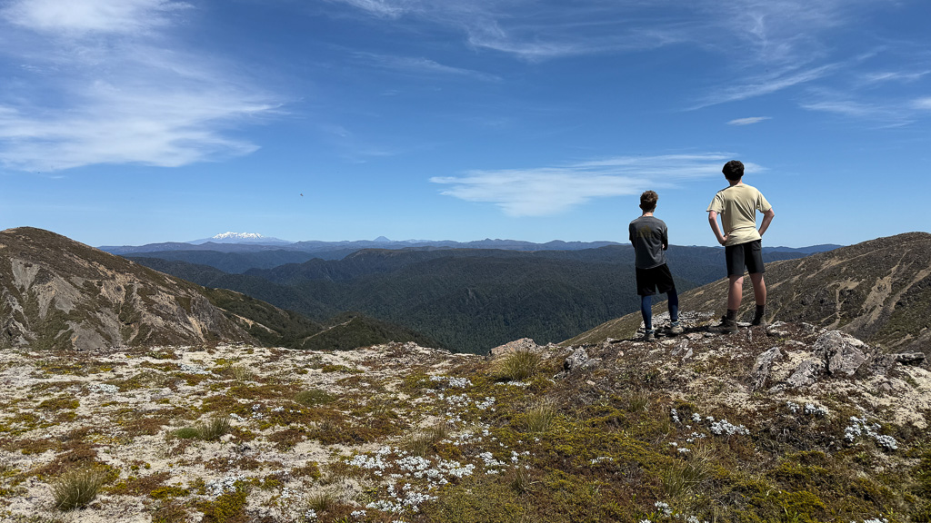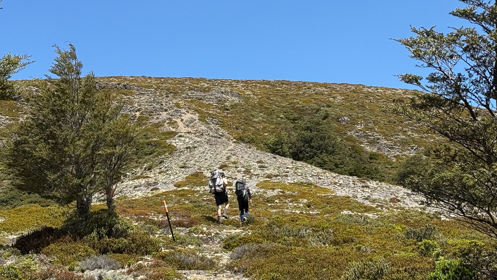 95. Les garcons restent au col, pendant que Mat et moi grimpons les derniers metres pour atteindre Whetu, a 1650m.