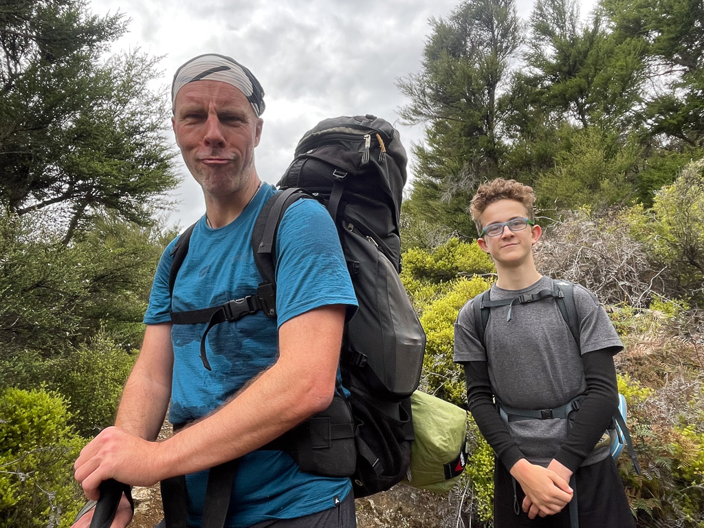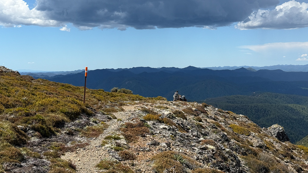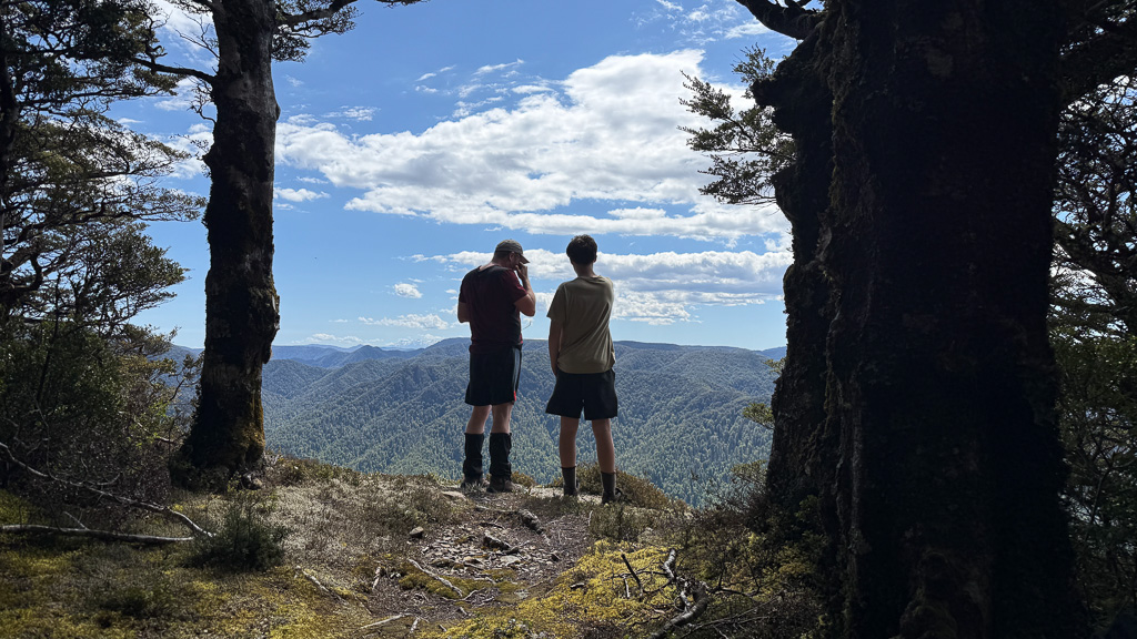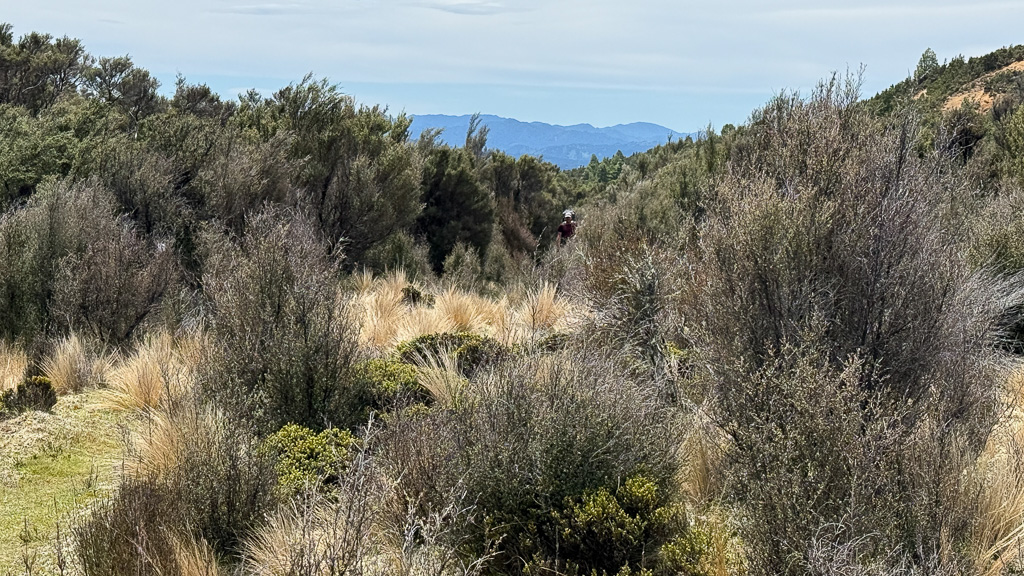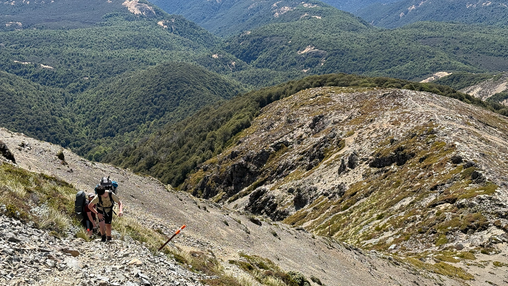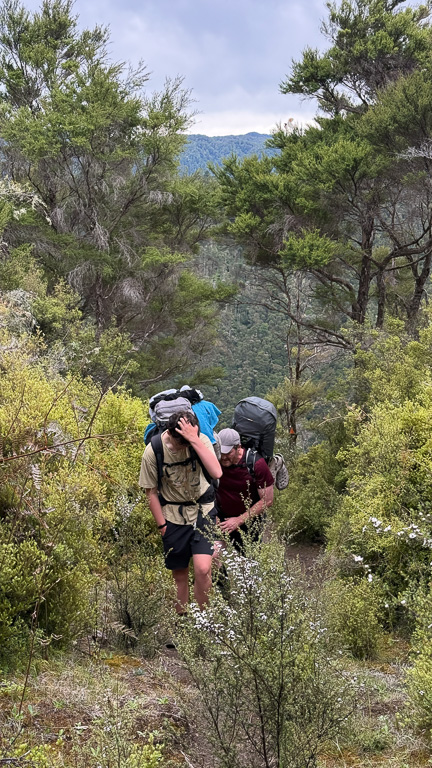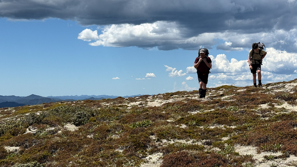95. Les garcons restent au col, pendant que Mat et moi grimpons les derniers metres pour atteindre Whetu, a 1650m.