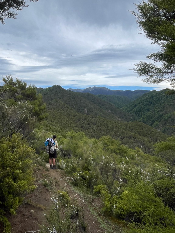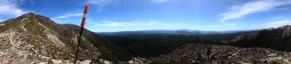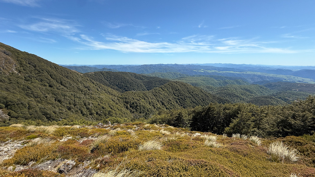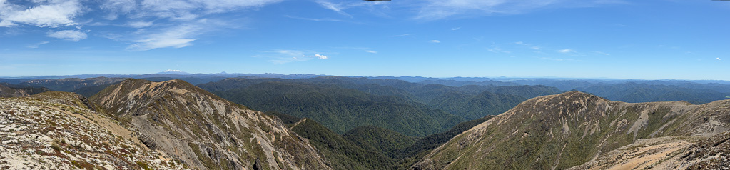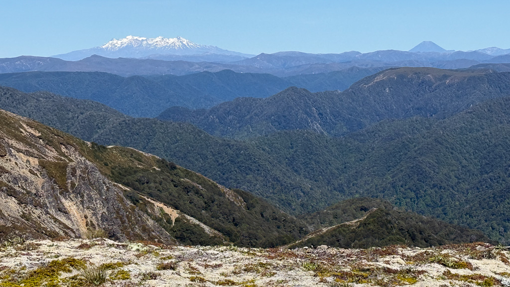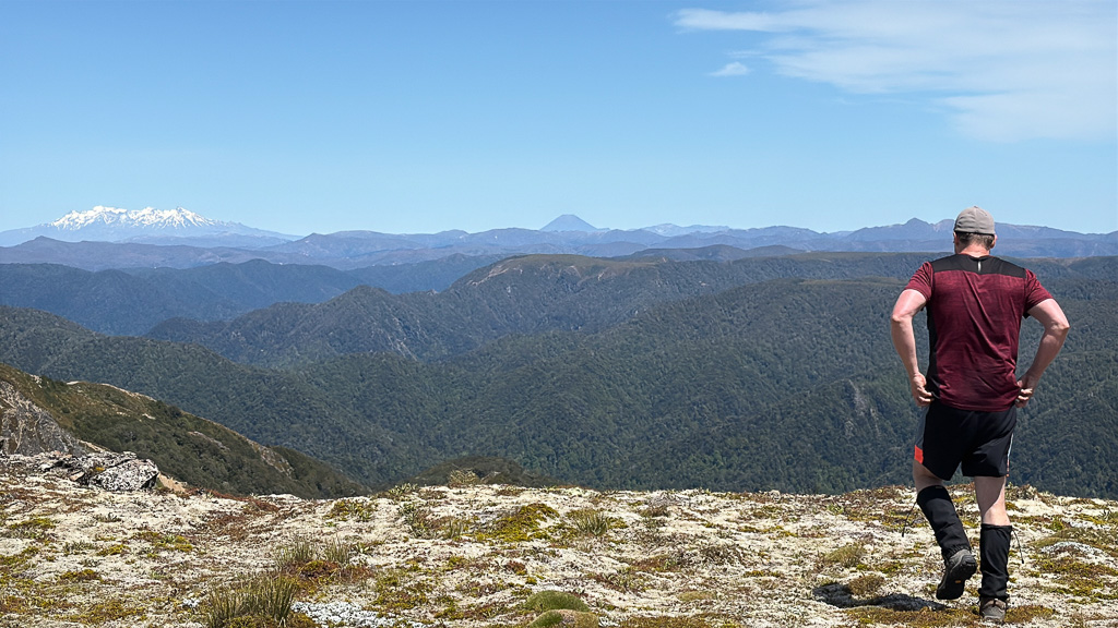 88. Arrive a la crete (~1600m), un panorama de montagnes et de collines, couvertes de foret, se deroule devant nous, et au fond, le Tongariro et Ngauruhoe.