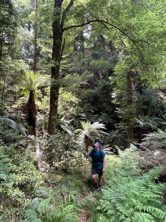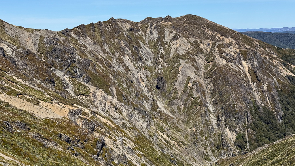 21. Adan grimpe sans la moindre difficulte. Au loin, le sommet de droite, Whetu, ou nous devrions etre dans l'apres-midi.