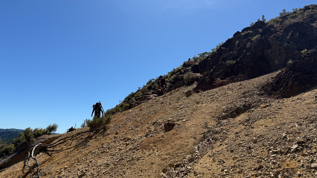101. Le soleil tape. Apres avoir rejoint les garcons, on redescend vers un bivouac. 280 metres de denivele sur un terrain exigeant pour les chaussures et les jambes.
