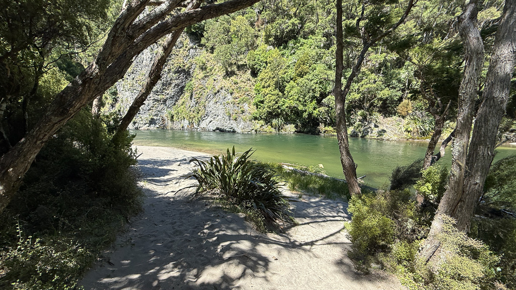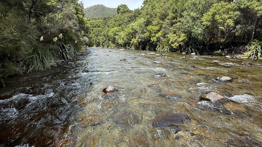 168. Midi trente. Nous voila arrives au parking. On enleve nos chaussures, on trouve un trou de riviere pour un brin de toilette ...
