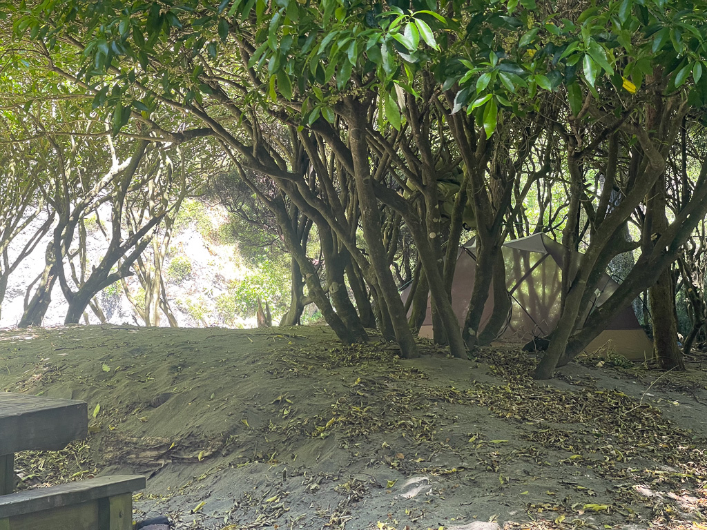 103. Le bivouac est comme prevu, tout petit. Meme s'il y a de l'eau et des toilettes, on voit mal comment on pourrait rester ici: les efforts pour y parvenir ont ete plus importants que prevu, ce qui rendra la marche demain, surement trop difficile.
