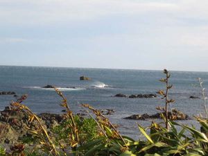 La route empruntée passe par le front de mer, relativement sauvage et déchiré par les vents et la houle provenant du Sud. Les maisons, de style très varié, bordent l'autre coté de la route. Le relief leur vole le soleil dès l'heure du midi. Dommage !