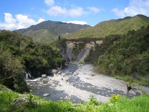 Les montagnes ne sont pas loin, et les maisons se raréfient à leur approche. Nous longeons la Otaki Gorge qui s’enfonce dans la chaîne de montagnes dont nous connaissons déjà le versant Est pour nous y être promenés la semaine dernière en visitant le Wairarapa. L’endroit, probablement plus fréquenté lorsque les températures plus clémentes de l’été font leur apparition, est magnifique. Les paysages ont été creusés par les torrents que des ponts suspendus permettent d’enjamber. La fraicheur de l’eau n’empêchera pas Benoît de s’y baigner :-).