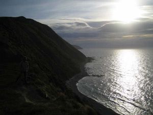 A part ça, histoire de nous distraire un peu, Ben et moi sommes allés visiter l’extrème Sud Ouest de l’ile du Nord, du coté de Makara, samedi en fin d’après midi. Situé à moins de 45mn de Wellington, cet endroit sauvage, montagneux, et face à la mer a quelque chose de typique. Un des paysages que nous nous attendions à trouver en NZ. Appelés par le grand air, nous nous sommes lancés dans une promenade de 2h le long du littoral, au soleil couchant. Que c’était beau !!