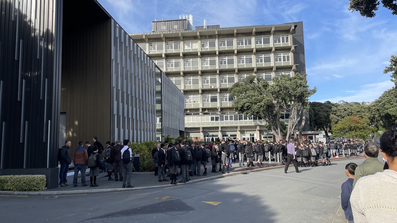 Nous sommes arrives tot a Wellington College pour le powhiri d'Adan. Victor nous a accueilli, permettant a Adan d'epousseter un peu de sa nervosite. Vers 8h30, nous avons glisse vers l'entree du Allan Gibbs Hall. Victor nous a presente Fred, le head boy, un garcon de 18 ans plus grand que moi s'exprimant avec aisance et grace. Les Year 9 s'etaient agglutines ensemble d'un cote du chemin traversant le College, et les parents de l'autre. Alors que nous discutions avec Victor, sans prevenir et sans un mot, Adan a fait un pas, puis un second, a traverse la route et a rejoint les autres eleves. Ce moment silencieux dans le brouhaha des etudiants me secoua plus que de raison, alors que sa silhouette disparut dans la masse noire et grise des uniformes. J'etais triste, fier, et soulage quand je constatai, quelques minutes plus tard, qu'il avait trouve un autre garcon avec qui discuter. C'etait Hugo, un eleve qu'il avait connu a EBIS, et c'est a ses cotes qu'ils rentrerent dans le hall avec la foule des autres Year 9. Les parents leurs emboiterent le pas.