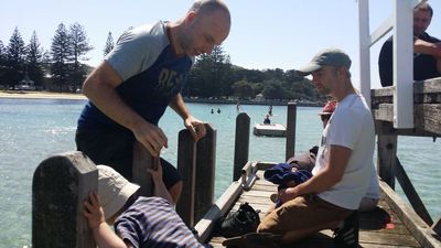 Nous n'etions pas sortis de Wellington depuis longtemps, et aujourd'hui, c'etait imperatif que nous partions prendre l'air. Nous sommes partis a Peka Peka, ou il faisait froid mais beau. On a pris un pique-nique a Olde Beach Bakery en passant. Les enfants ont passe une journee extraordinaire a jouer. Ici, avec une planche trouvee sur la plage et un tronc echoue, ils ont fabrique une balancoire.