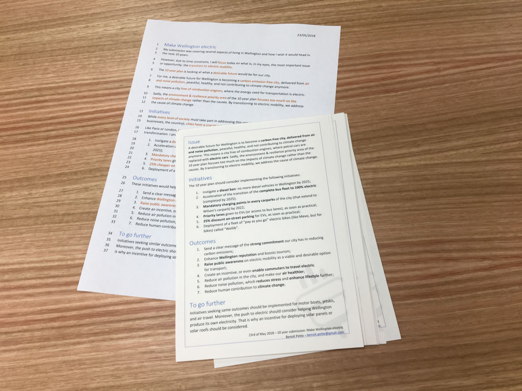 J'ai donc pris ma tablette, jete quelques idees, mis de l'ordre, sans vraiment avoir le temps de stresser. Face a moi se trouvait Chris Laidlaw, le president, Barbara Donaldson, la directrice de comite (une "lumiere", elle), et des conseillers municipaux et regionaux. Apres mon petit expose, plutot bien ficele au vu des circonstances, Chris Laidlaw m'a pose quelques questions. Son argumentation fut qu'en 2021, alors que les 82 bus electriques seront en service, Wellington aurait la grosse proportion (20%) de bus a batteries au monde. Il se demanda ensuite a voix haute quand cette transition vers le tout electrique devrait se produire, et qui devrait payer. Autant de reflexions revelatrices de son manque de vision, selon moi: ce n'est pas a qui aura la plus grosse, ni si le climat peut attendre encore un peu que nous decidions qui paye. Tout le monde doit payer, maintenant, et peu importe si nous sommes les premiers a avoir une flotte 100% electrique. Au final, la planete devra faire cette transition. Pour le financement, il s'agit de connaitre ses priorites et de les orienter vers la construction d'un monde meilleur, avec un fardeau partage par la communaute et les utilisateurs.