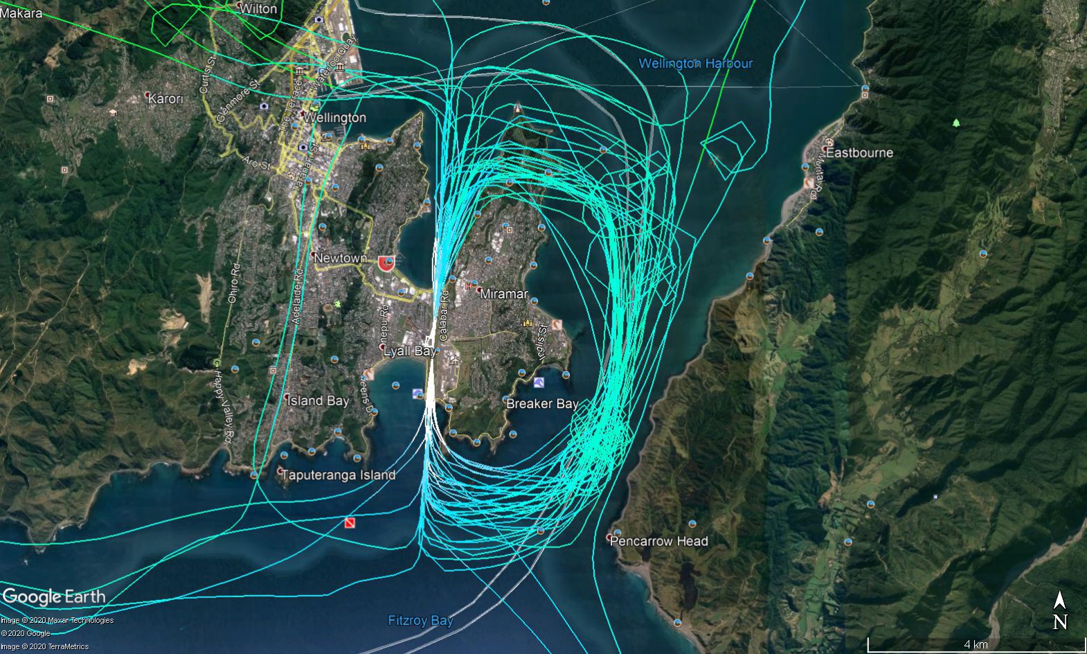 Et oui, c'est toujours l'aero club. Cette trace, ce n'est qu'un avion parmi les 2 ou 3 qui volent simultanement, et ils reinitialisent la trace tous les 3 ou 4 tours ... avant de recommencer. Comment croire que cela puisse etre accepte? Acceptable? Normal? Comment ne pas voir de tels comportements comme egoistes? Pour moi, ils ne sont pas mieux que les vandales faisant des donuts en JetSki.