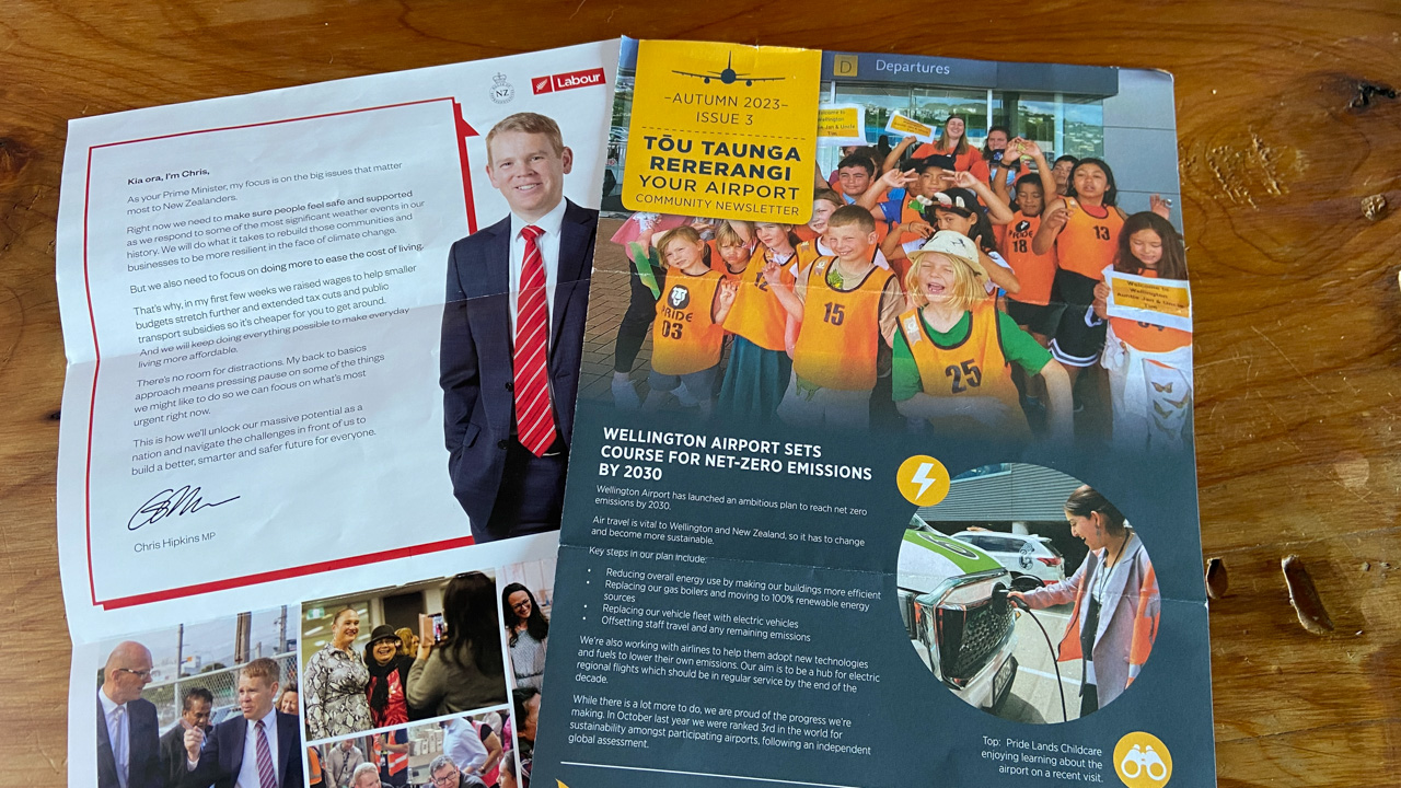 C'est un long debat. Mais on a recu dans la boite aux lettres ces deux depliants. L'un pour promouvoir l'action de l'actuel premier ministre, en prevision des prochaines elections. Son programme? Retourner au "basiques", a "l'essentiel". Bref, vision zero. Et a cote, un depliant de l'aeroport et son greenwashing ecoeurant. Bref, deux depliants, deux raisons d'angoisser.