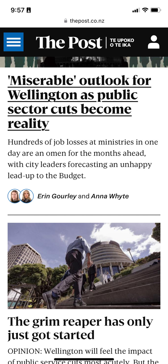 Avec les coupes sombres dans les effectifs du secteur public, l'ambiance a Wellington est un peu angoissante, comme le reflete cette pleine page du Post.